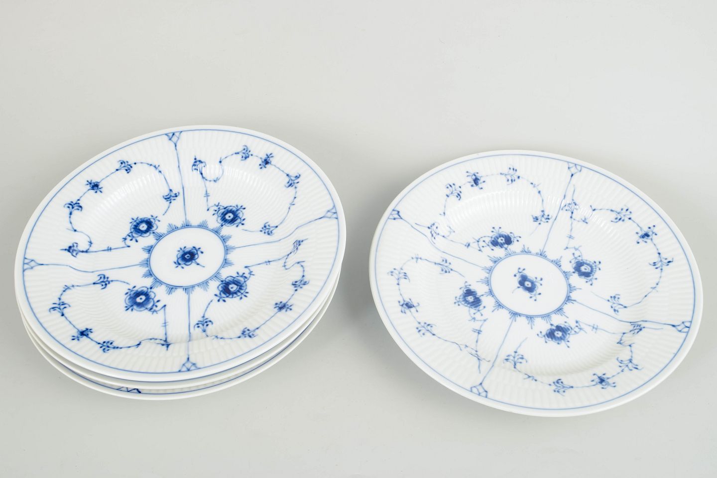 Royal Copenhagen, Musselmalet riflet, sæt på 4 middagstallerkener.