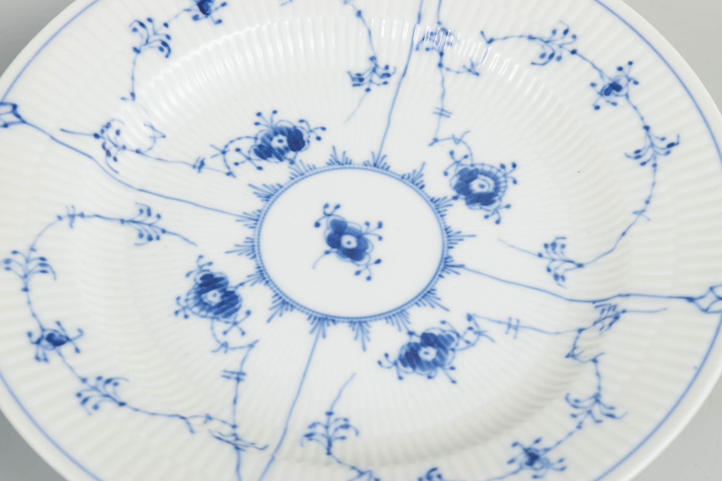 Royal Copenhagen blev grundlagt i 1775 og er Danmarks mest anerkendte porcelænsfabrik. Musselmalet riflet er fabrikkens ældste stel og har været i kontinuerlig produktion siden slutningen af 1700-tallet. Stellet er kendetegnet ved den riflede form og den præcist håndmalede blå dekoration, udført efter faste traditionelle mønstre, hvilket gør hver genstand til et klassisk eksempel på dansk porcelænshåndværk.