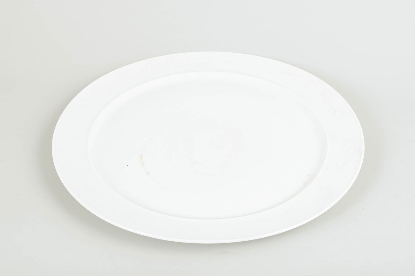 Stort rundt serveringsfad i hvidglaseret porcelæn med bred fane. Produceret i Tyskland og mærket på undersiden med grønt Rosenthal-stempel.