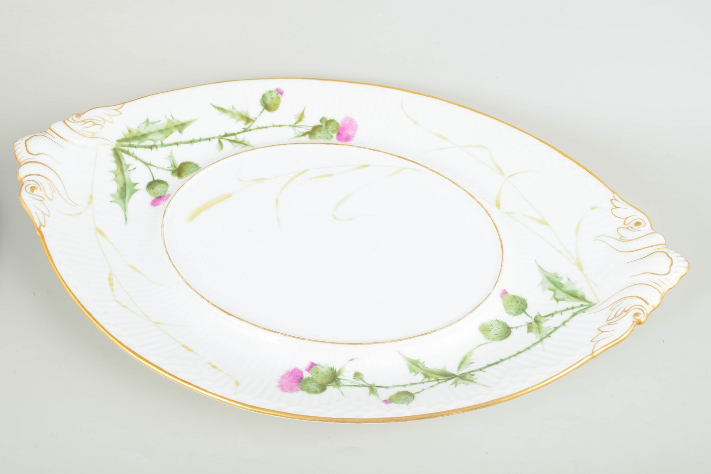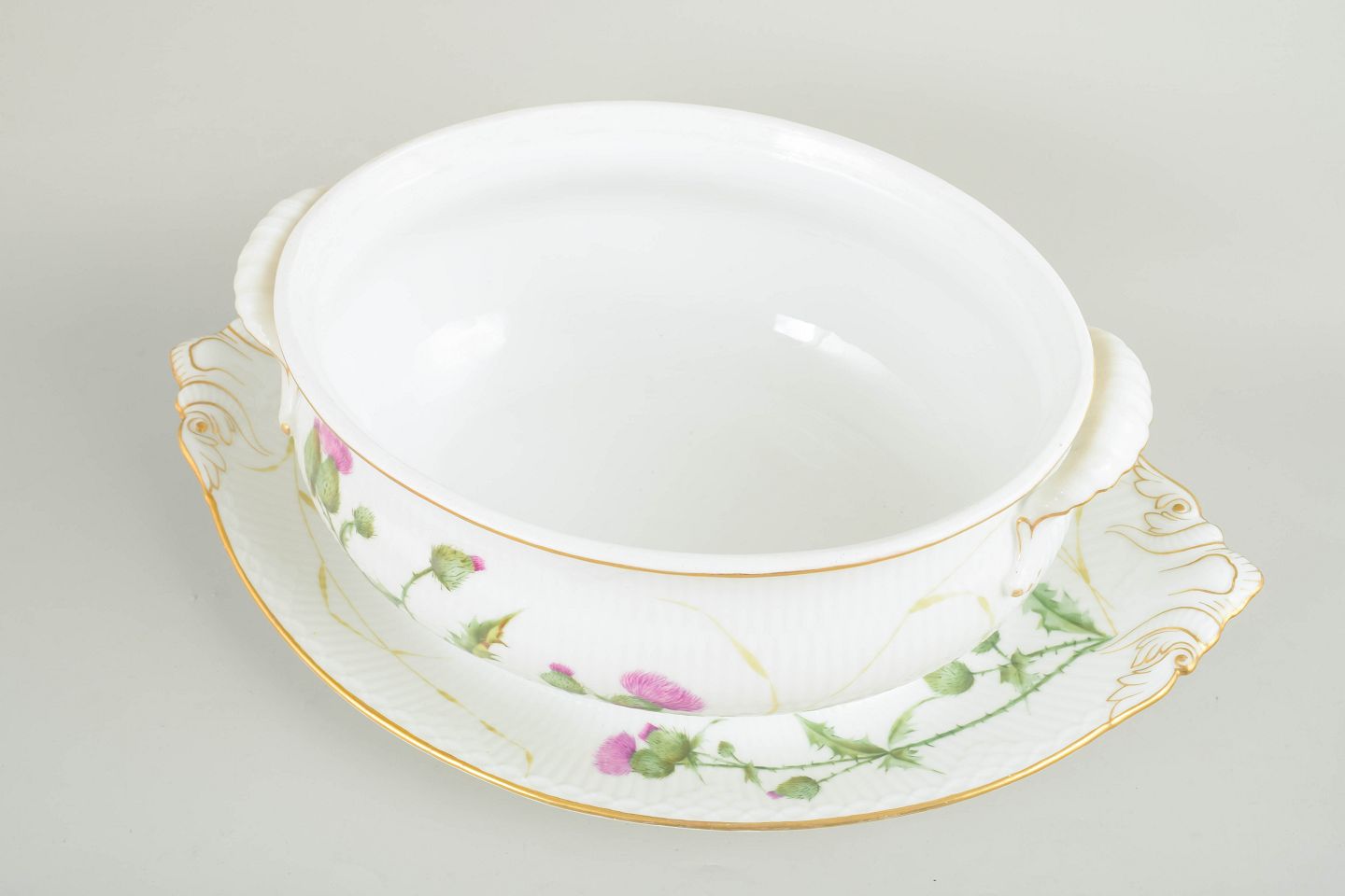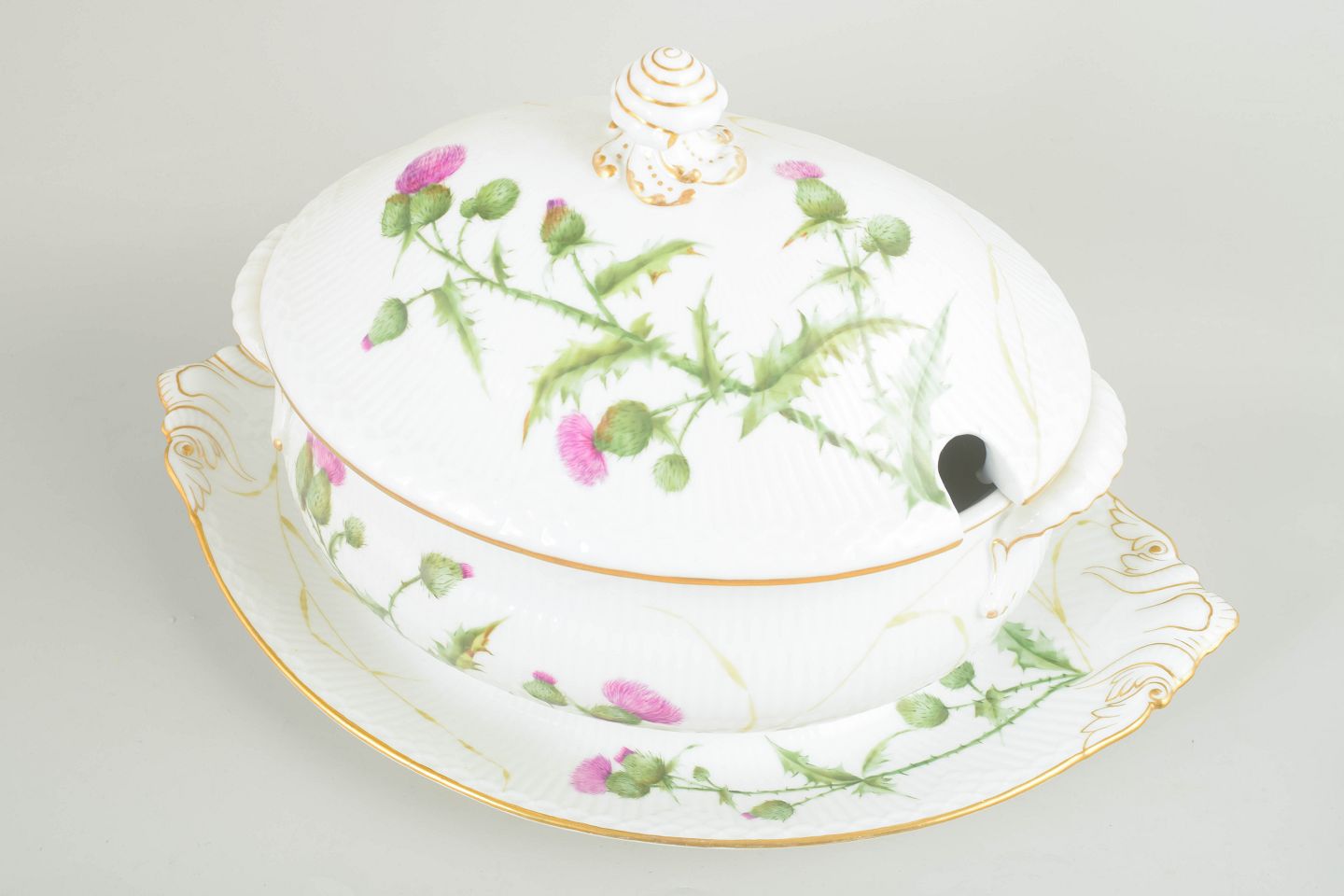 Stor håndmalet suppeterrin i porcelæn med tilhørende fad, dekoreret med naturalistisk tidselmotiv og fine forgyldte detaljer. Udført i høj håndværksmæssig kvalitet, karakteristisk for Royal Copenhagens repræsentative serveringsdele fra det 19. århundrede.