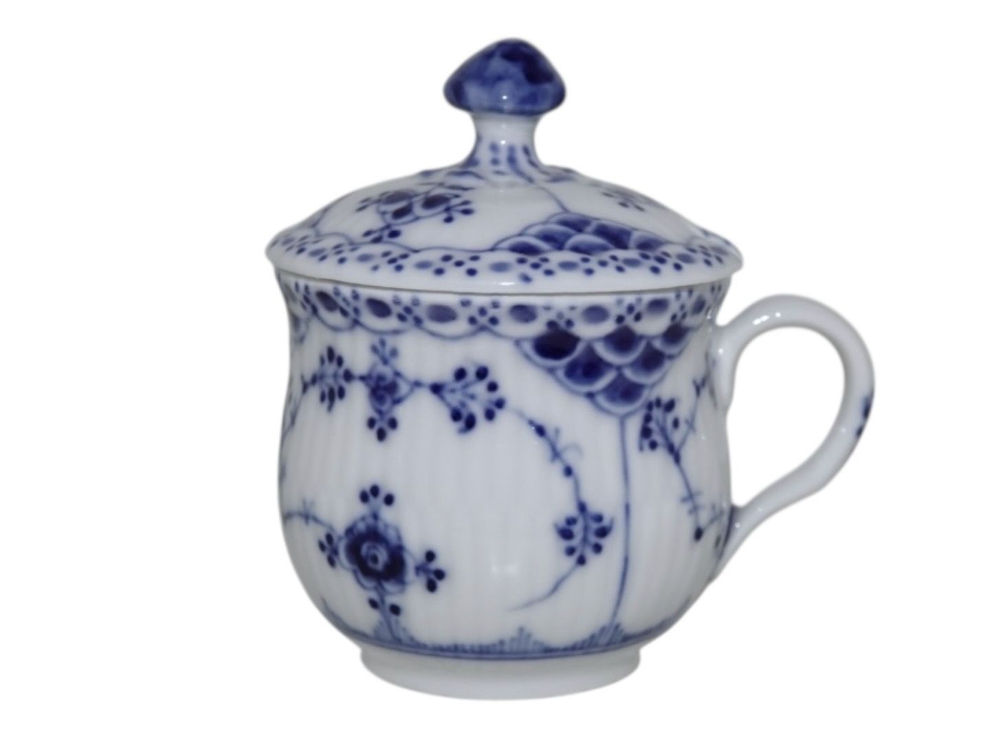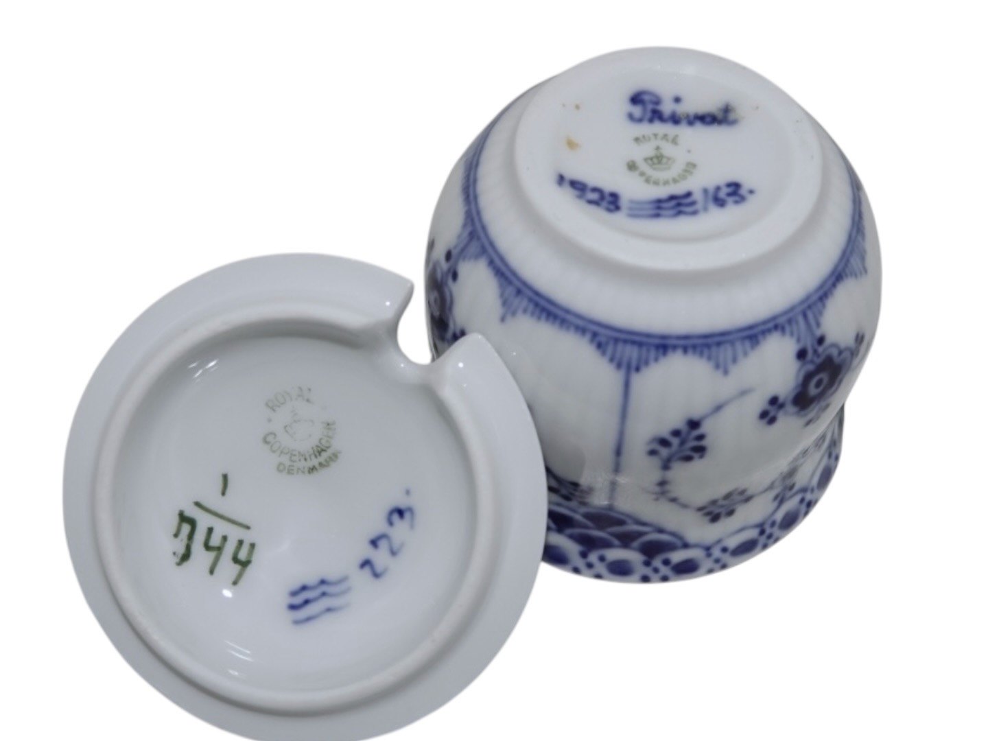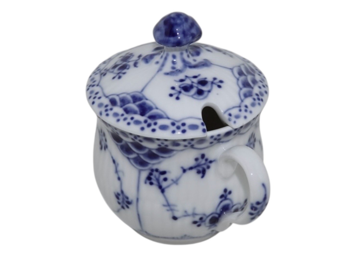 Royal Copenhagen Musselmalet Halvblonde, sennepskrukke med tilhørende låg fra 1923.