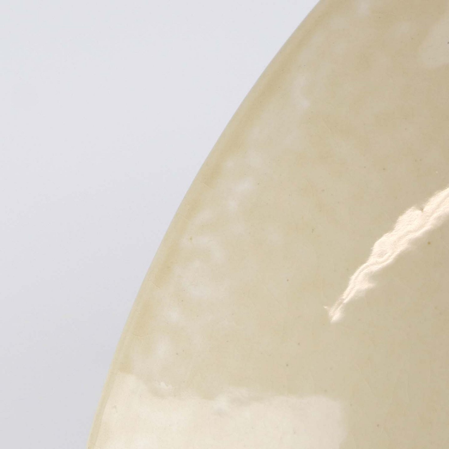 Fremstår med bruneringer under glasuren, krakkeleringer i glasuren og ujævnheder i glasurfarven på bagsiden.