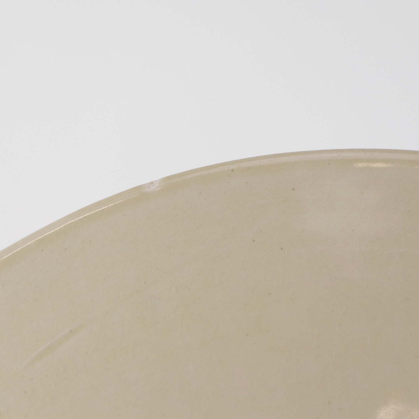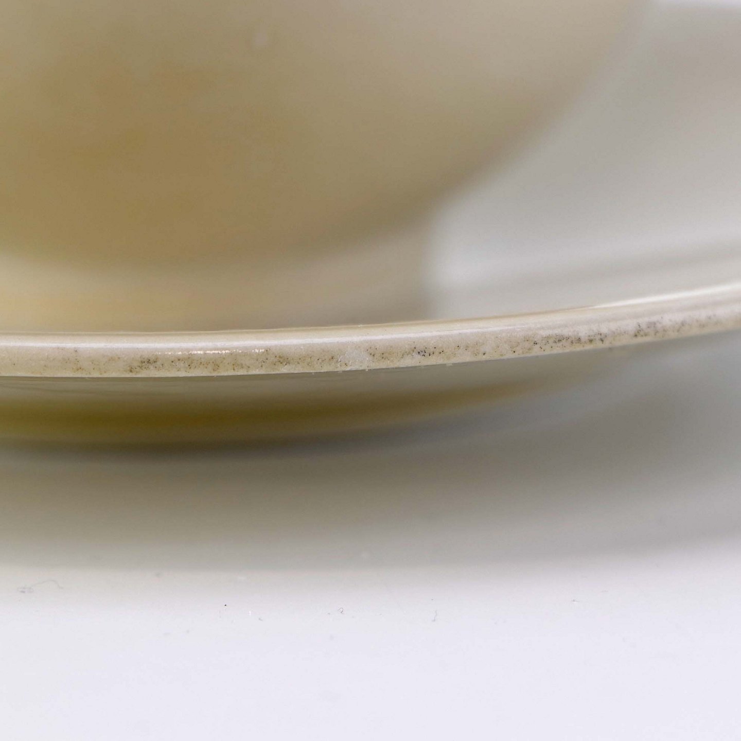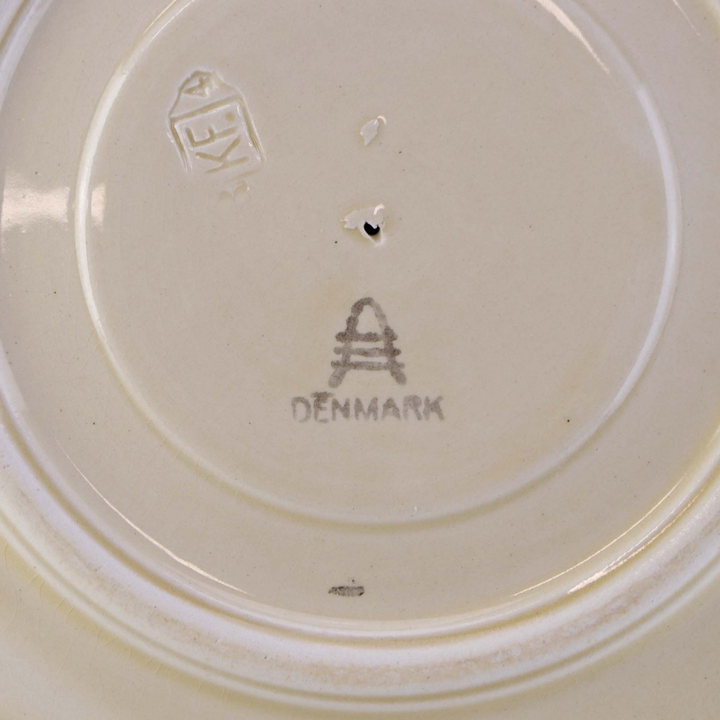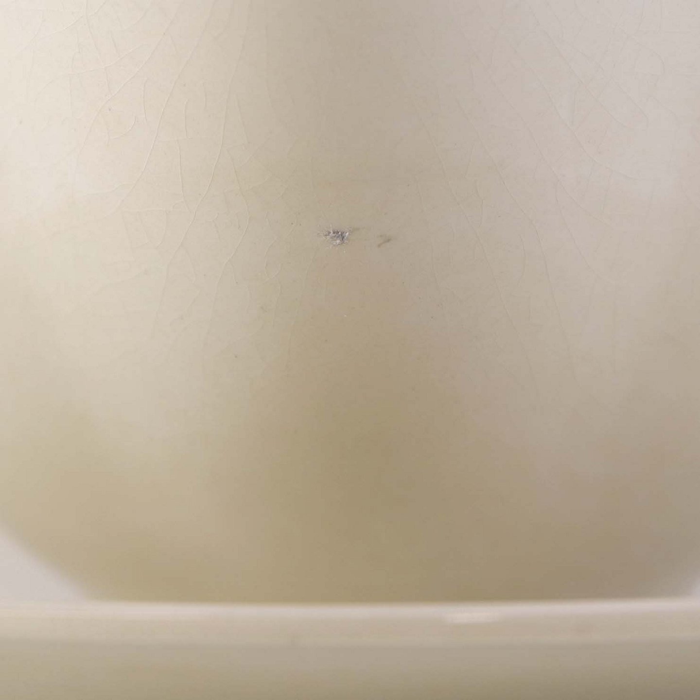 Fremstår med bruneringer under glasuren, krakkeleringer og ujævnheder i glasuren samt brugsspor langs topkanten.