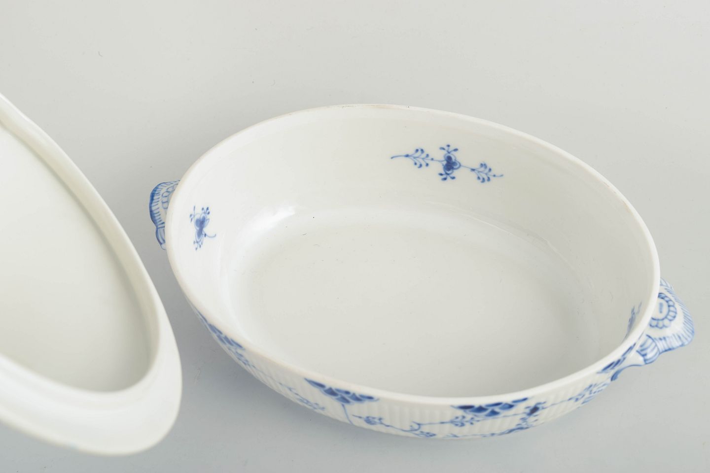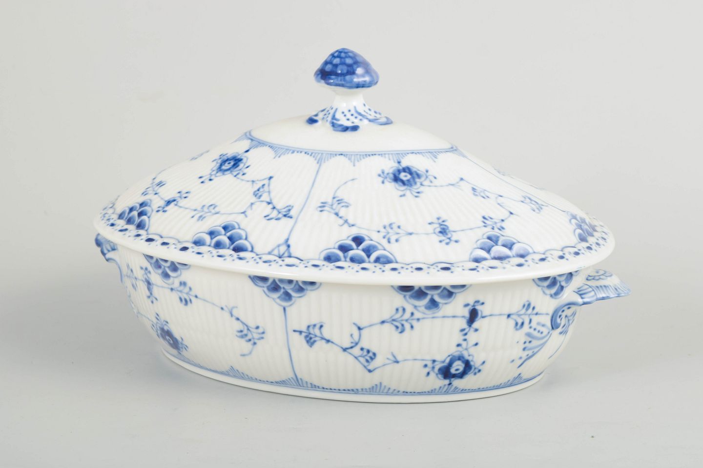 Terrin med låg i håndmalet porcelæn fra Musselmalet Halvblonde med klassisk underglasurdekoration i koboltblå, riflede felter og karakteristisk blondekant. Model 1/622. Første sortering. Fremstillet 1964.