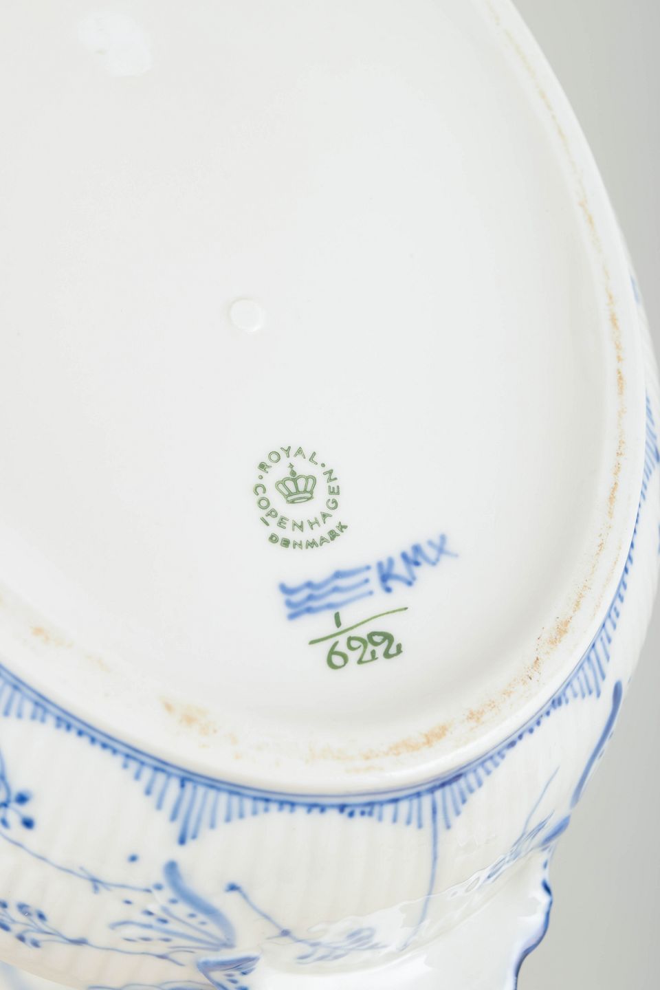 Royal Copenhagen blev grundlagt i 1775 i København under kongelig bevilling. Fabrikken er internationalt anerkendt for sit håndmalede porcelæn og sit høje kunstneriske niveau. Musselmalet Halvblonde er en variation af det klassiske Musselmalet stel og kombinerer riflede flader med en dekorativ blondekant, udført med stor håndværksmæssig præcision.