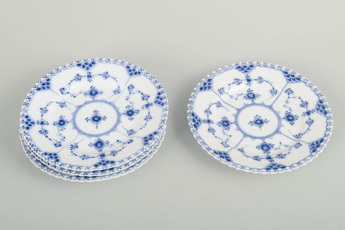 Sæt af fire kagetallerkener i håndmalet porcelæn fra Musselmalet Helblonde med klassisk underglasurdekoration i koboltblå og gennembrudt blondekant. Model 1/1088. Første sortering. Fremstillet i 1920’erne.