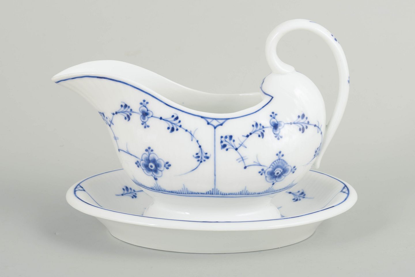 Sjælden antik sauceskål i håndmalet porcelæn fra Musselmalet Riflet med klassisk underglasurdekoration i koboltblå. Model 1/201. Med fast integreret underdel udført i ét stykke sammen med skålen. Første sortering. Fremstillet i 1890’erne.