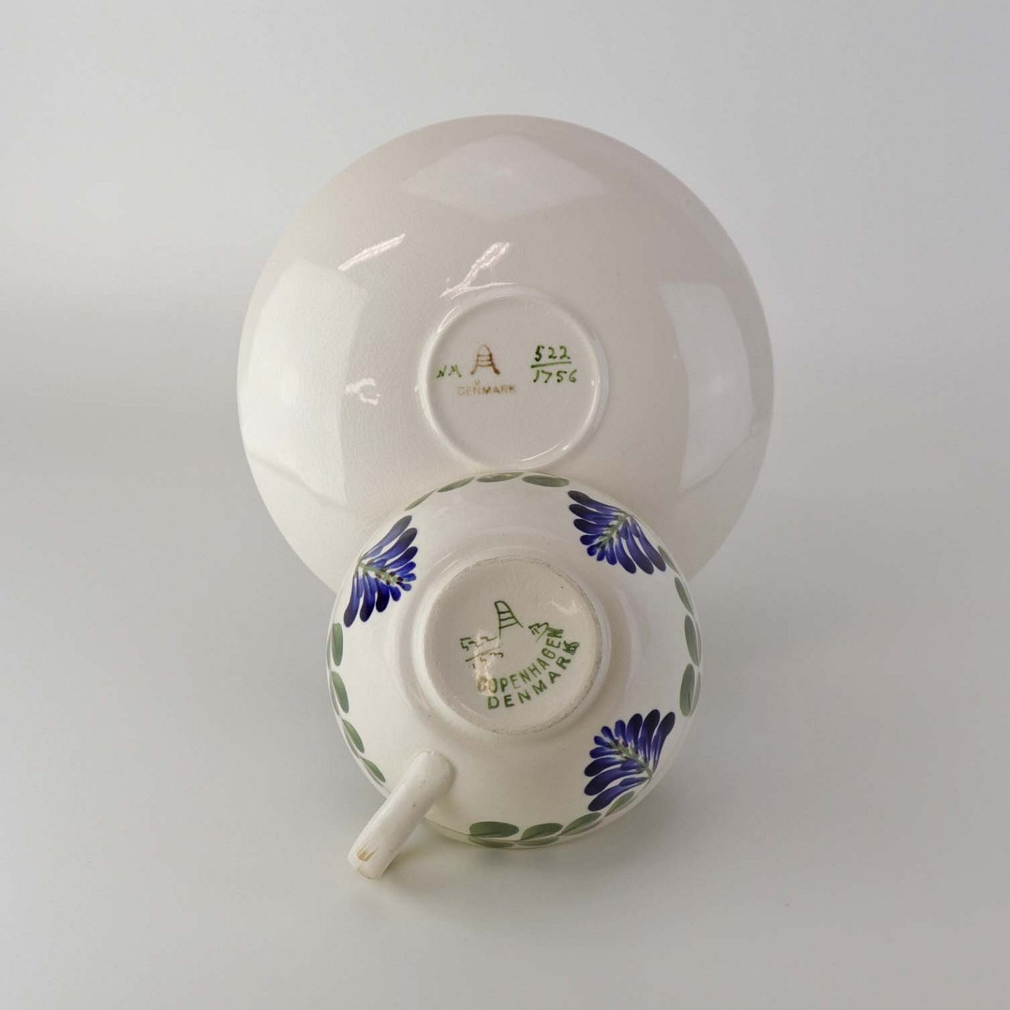 Tekop med underkop i fajance fra stellet Blåregn. Stellet er fremstillet i perioden år 1903-1933. Nr. 522/1756
