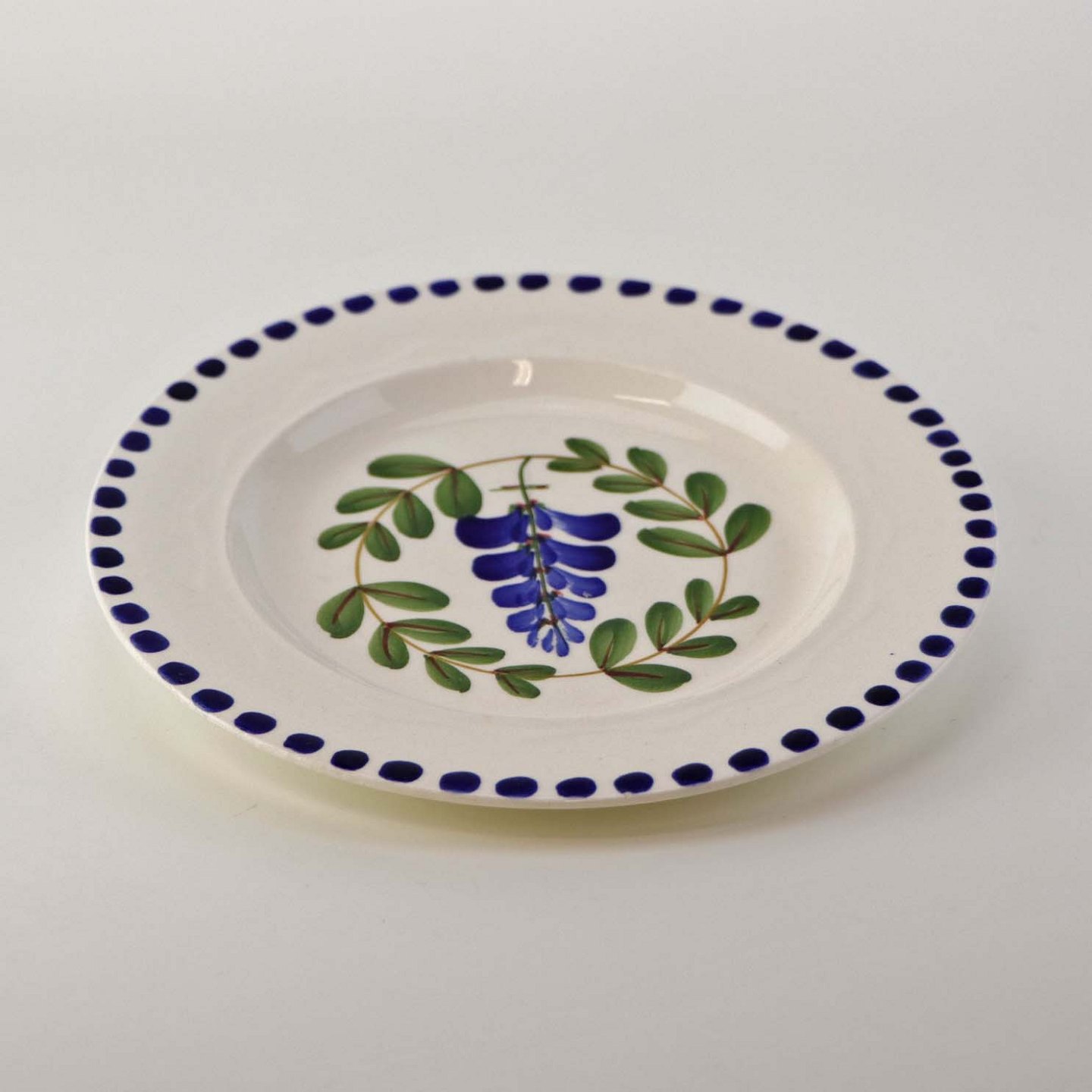 Fajancestel med dekoration af ranker af blåregn og blade på lys baggrund afsluttet med kant af runde blå pletter.