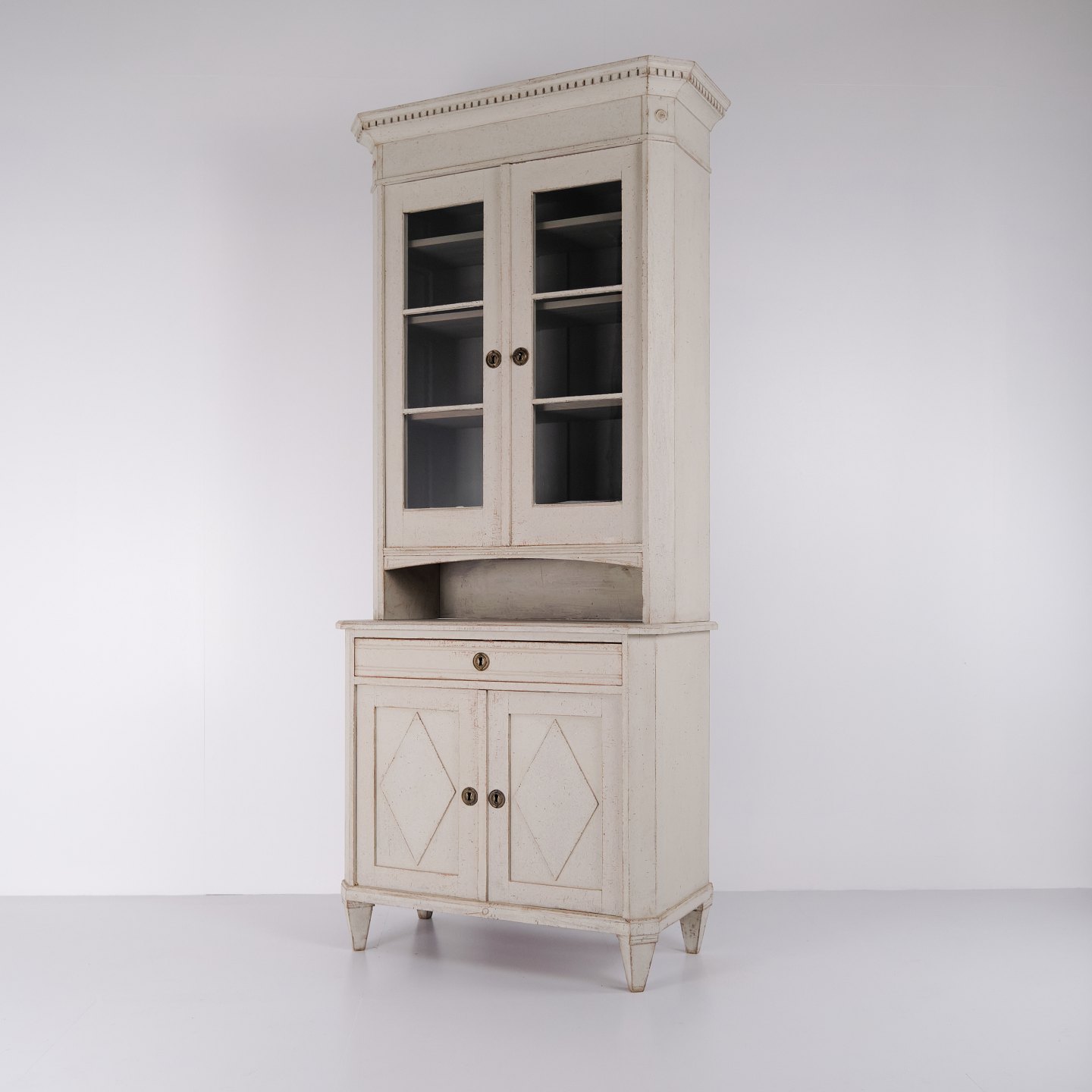 Stort svensk vitrineskab fra gustaviansk periode ca. 1790’erne. Glaslåger, hylder og skuffe.