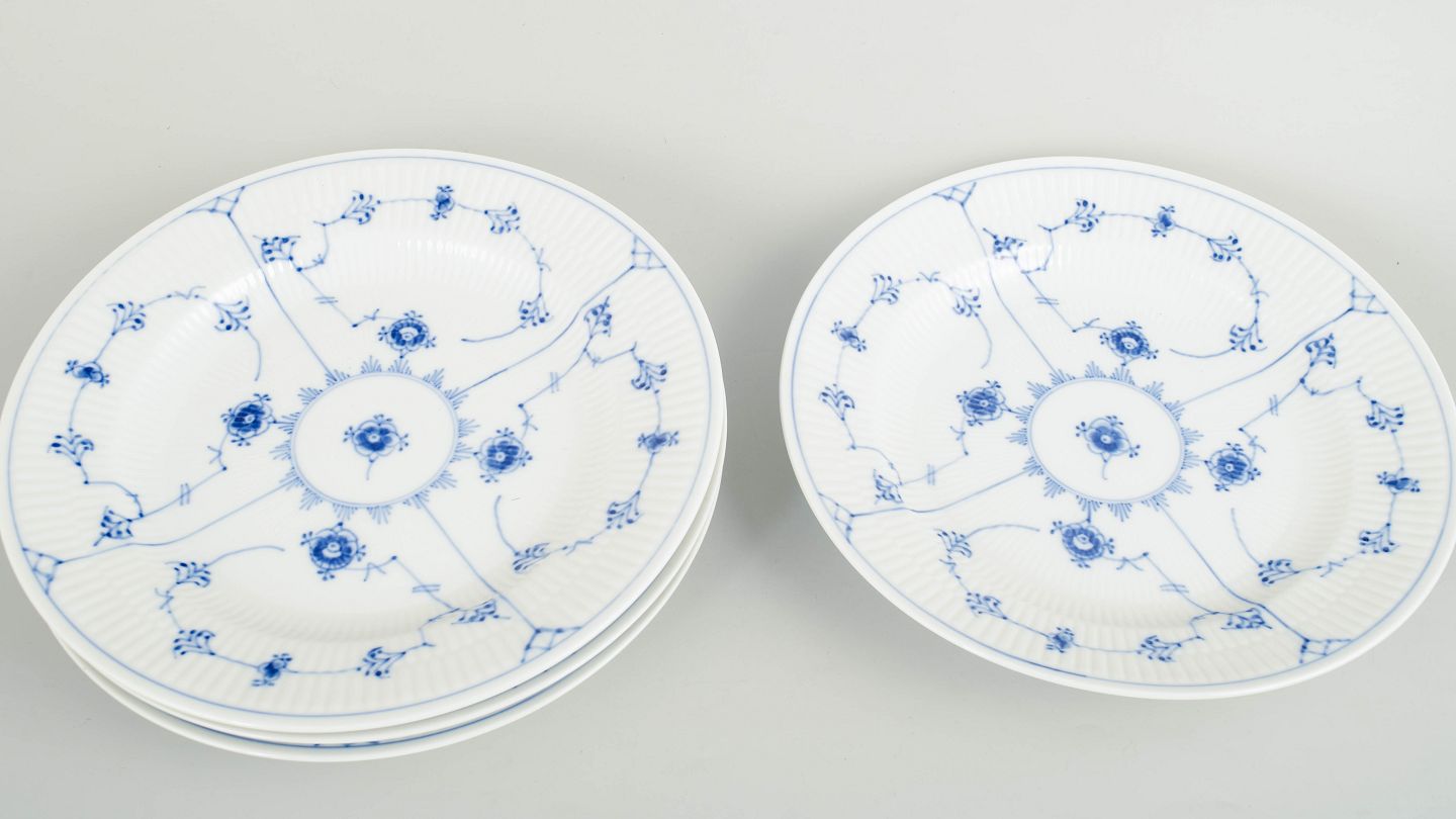 Royal Copenhagen Musselmalet Riflet, sæt af fire middagstallerkener.