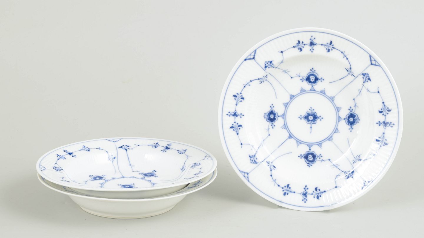 Sæt af tre dybe tallerkener i håndmalet porcelæn fra Musselmalet Riflet med klassisk underglasurdekoration i koboltblå. Model 1/170. Første sortering.