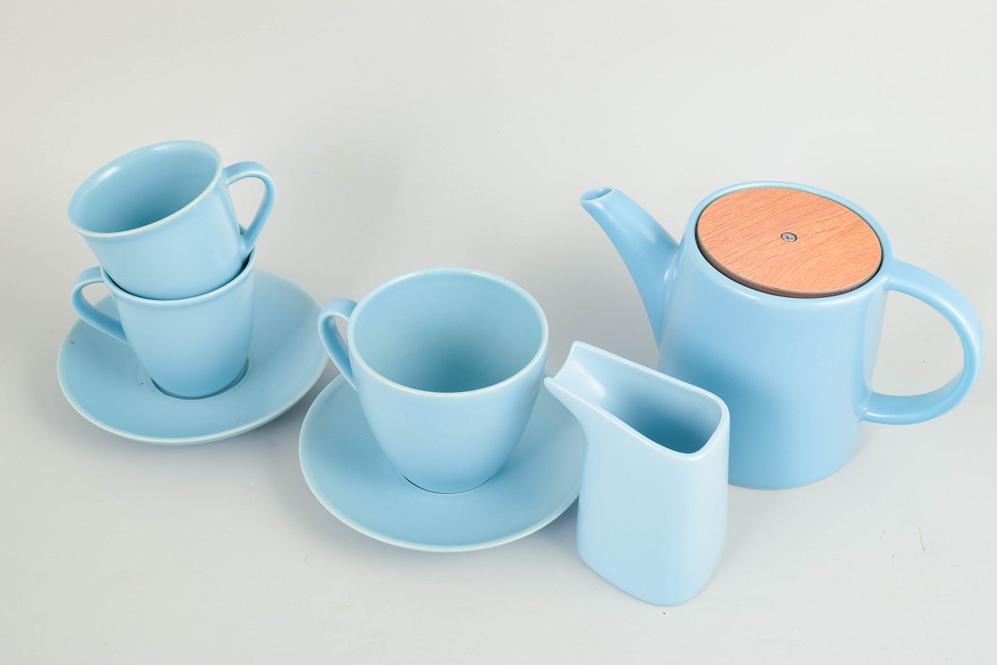 Tesæt i stentøj bestående af tre krus, tekande med tilhørende tesi, flødekande og underkopper. Udført i lyseblå glasur med enkle moderne former. Stemplet Höganäs Keramik, Made in Sweden model 3.