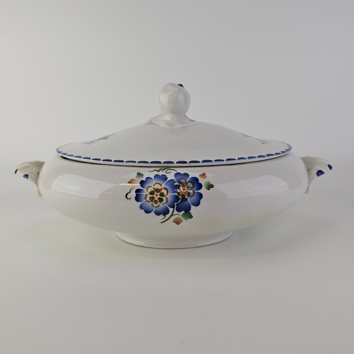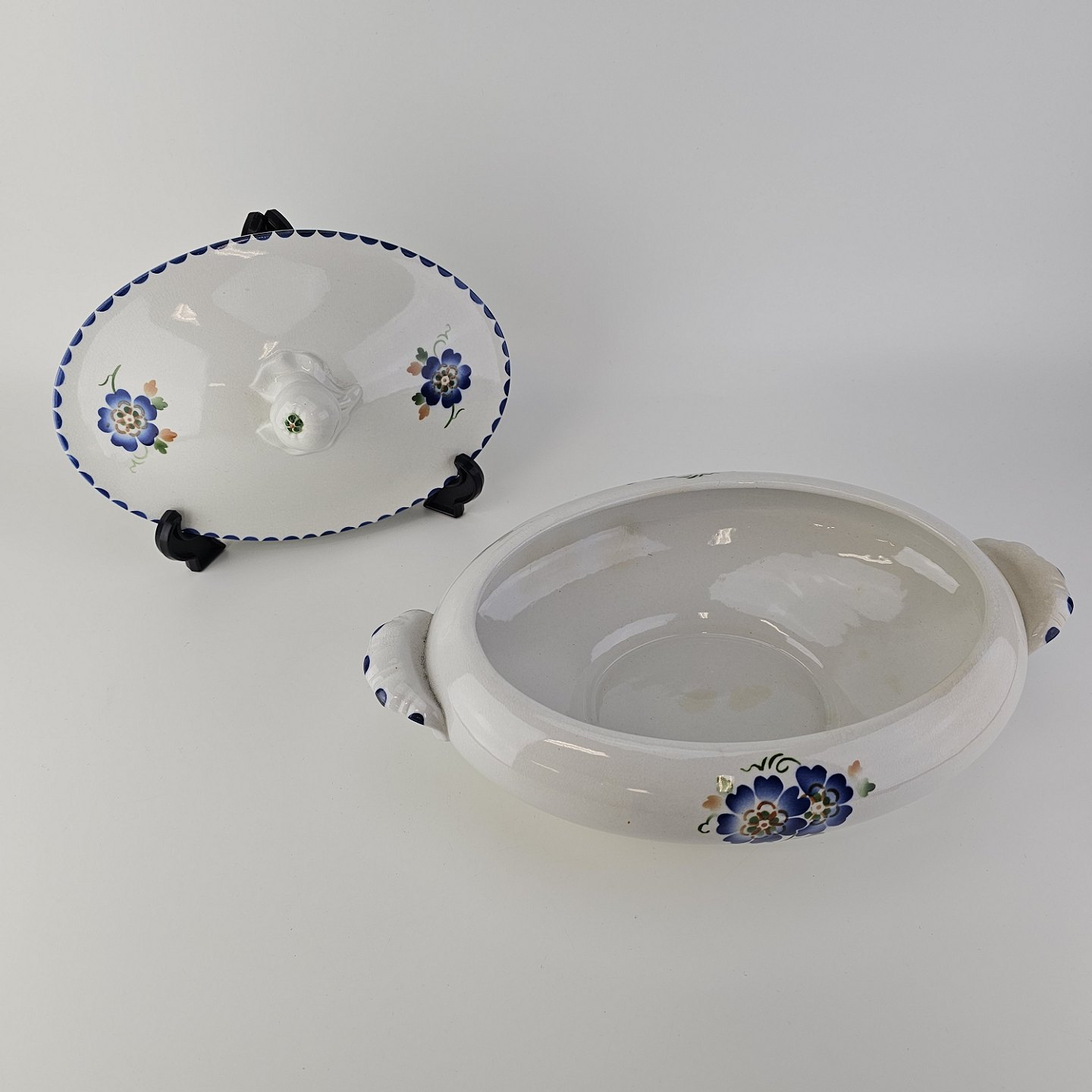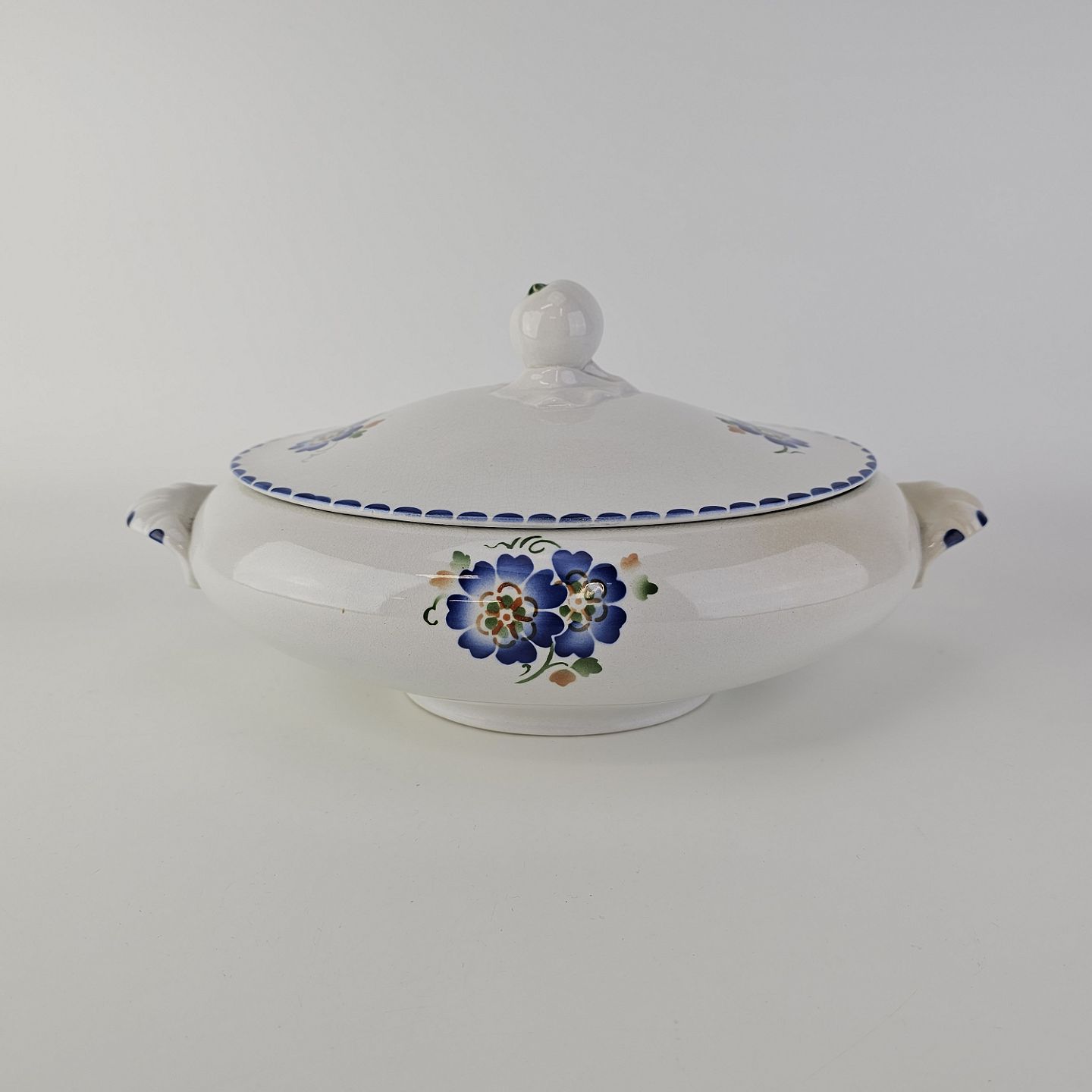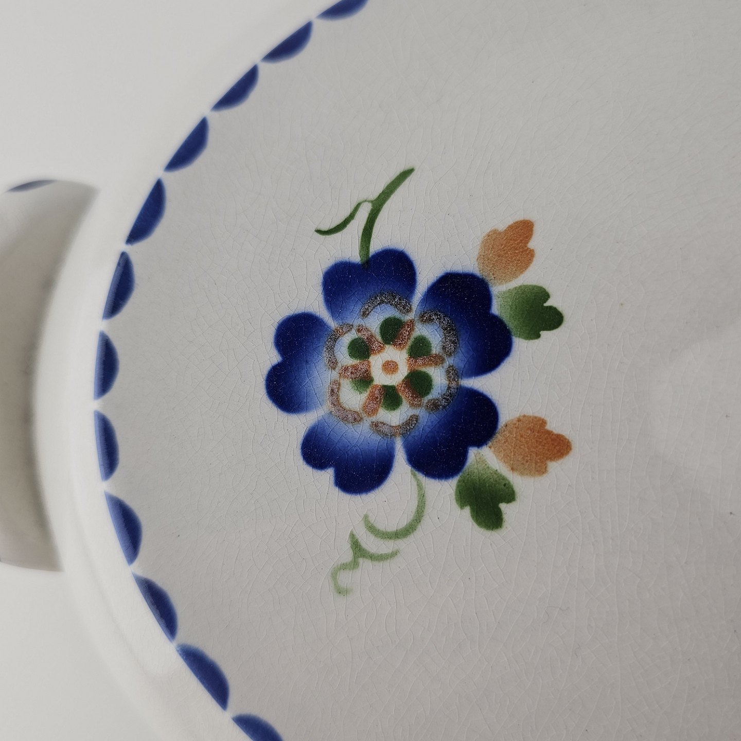 Hvidt fajancestel i stelform Sterling med motiv af blå blomster og blå prikker på kanten.