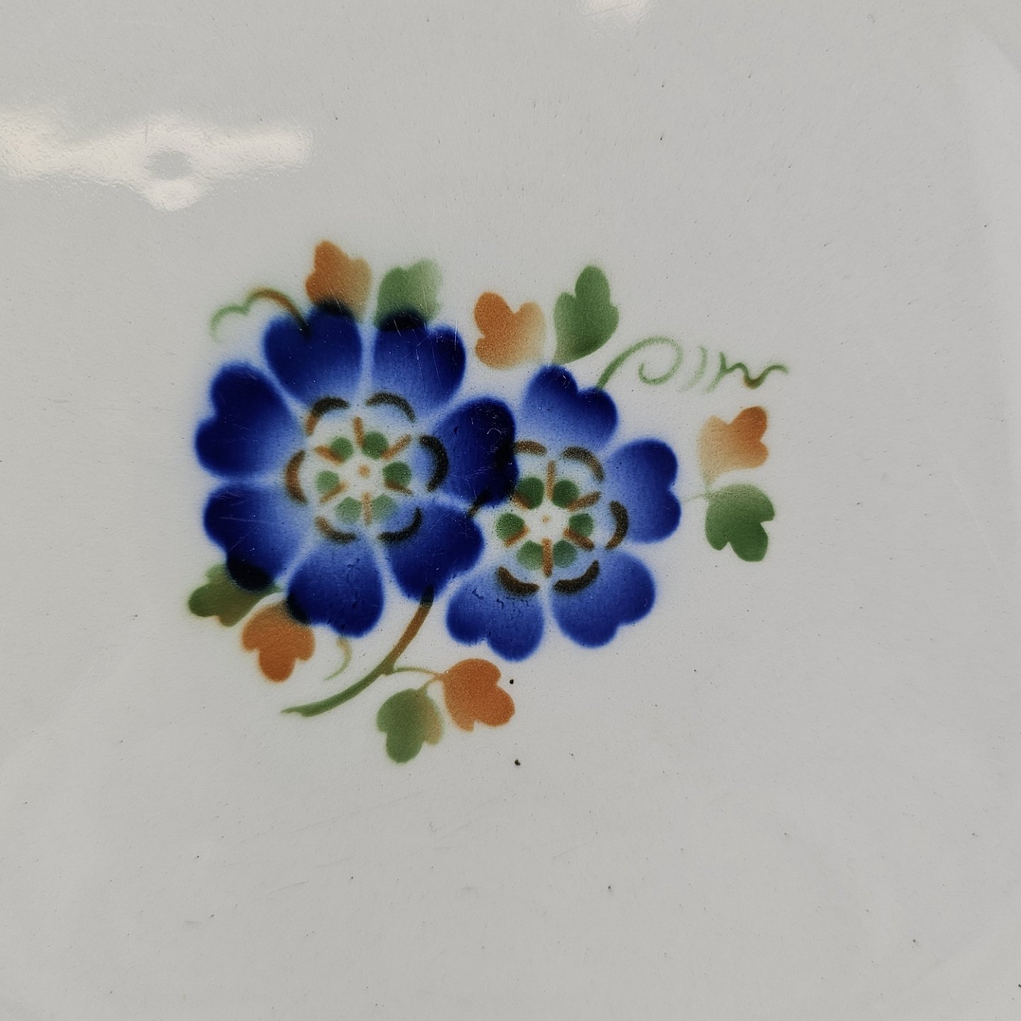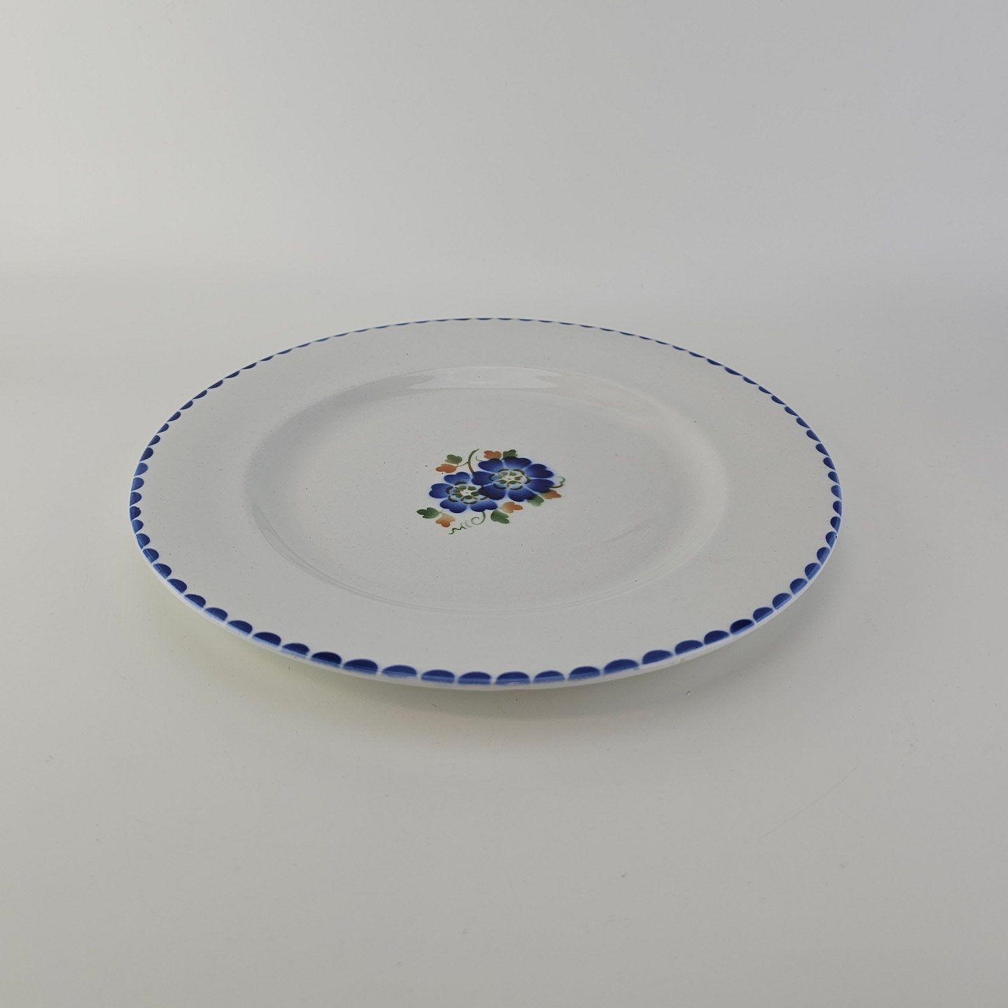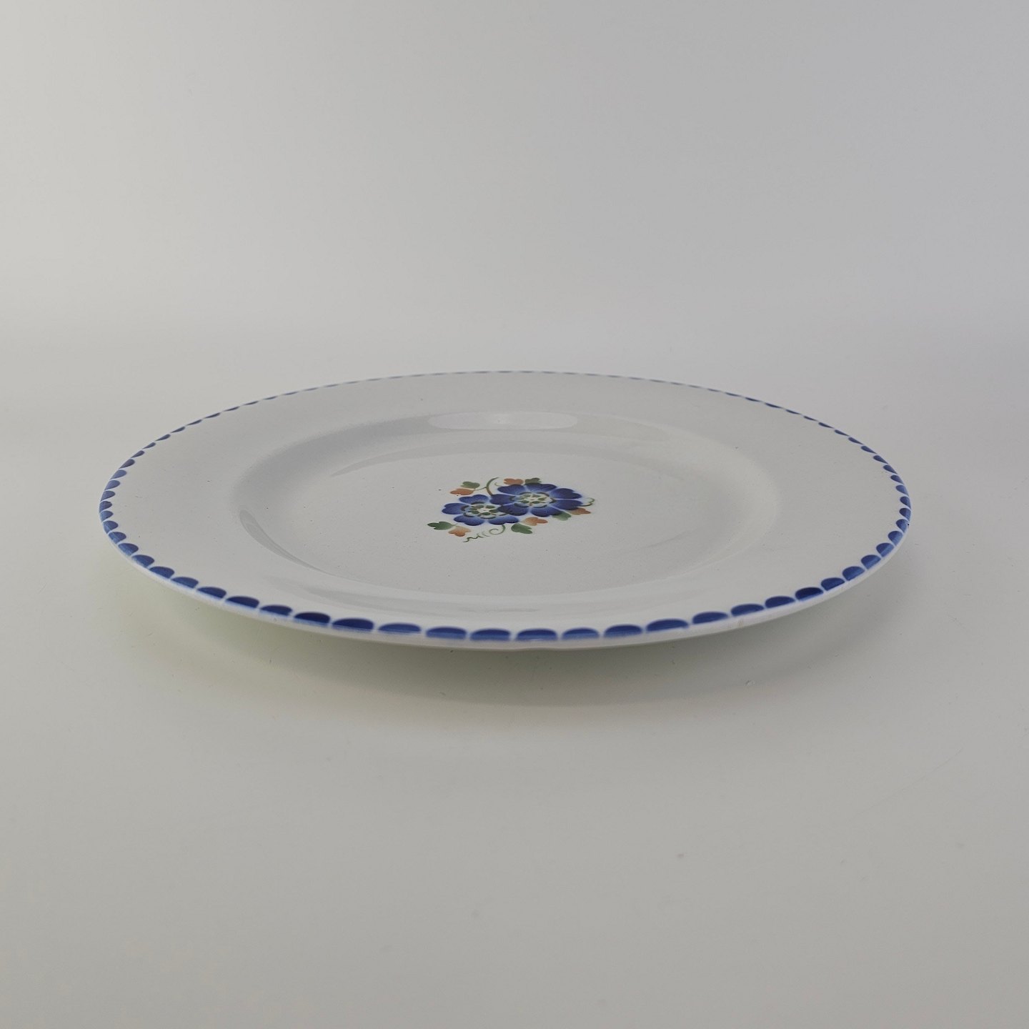 Flad middagstallerken i fajance fra stellet Geranium II fremstillet i perioden 1927-1940.