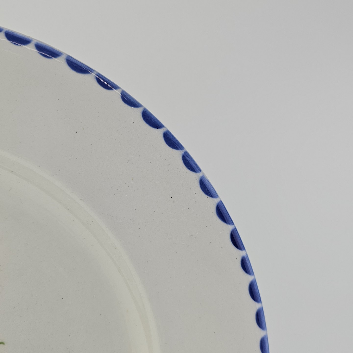 Hvidt fajancestel i stelform Sterling med motiv af blå blomster og blå prikker på kanten.