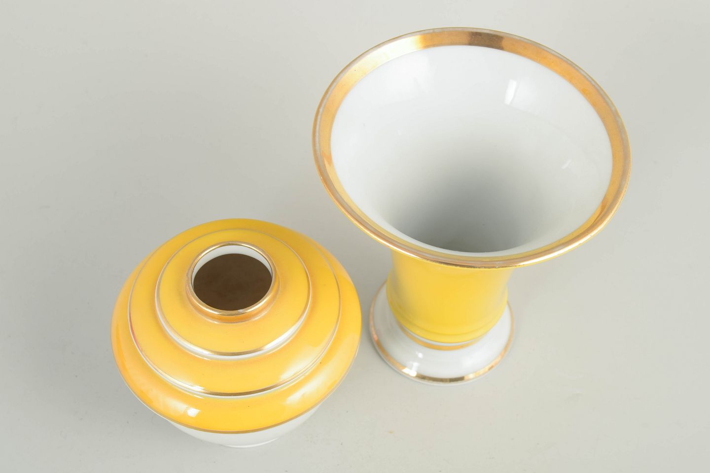 To vaser i porcelæn med klassiske art deco former og dekoration i hvide og gule nuancer med stafferinger i guld. Vaserne fremstår med elegante proportioner og karakteristisk stil fra tysk porcelænsproduktion i mellemkrigstiden.