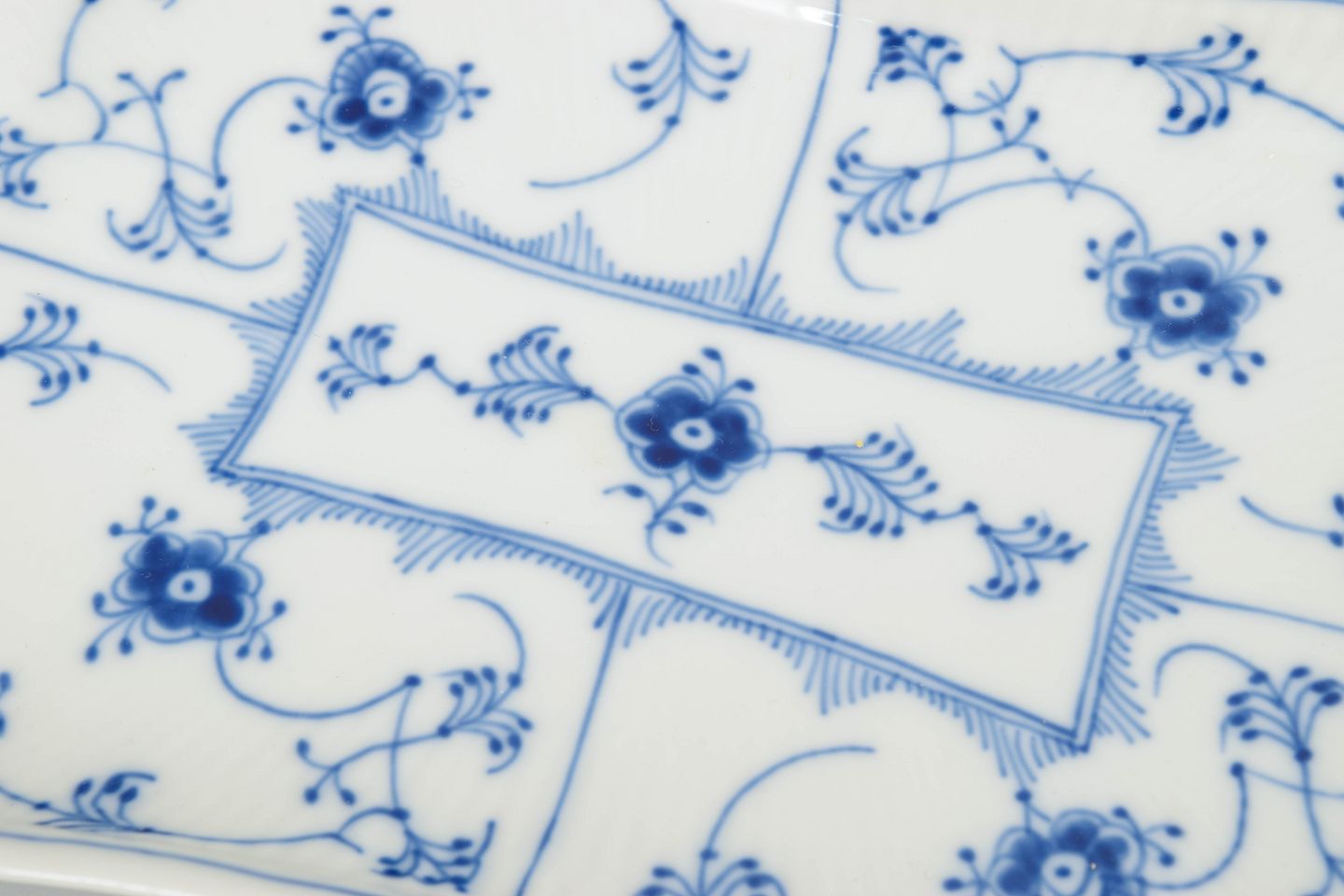 Bakke i håndmalet porcelæn fra Musselmalet Riflet med klassisk underglasurdekoration i koboltblå og riflede felter. Model 1/269. H. 16 cm, D. 24 cm. Annulleret med én indridset streg under bunden. Fremstillet i 1965.