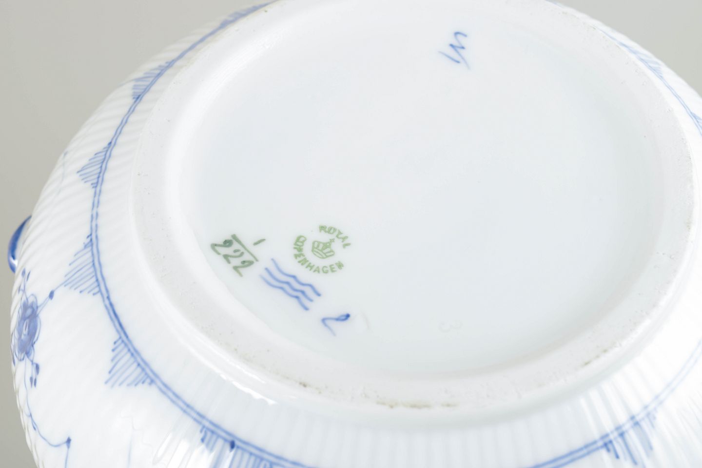 Stor suppeterrin med låg i håndmalet porcelæn fra Musselmalet Riflet med klassisk underglasurdekoration i koboltblå og riflede felter. Model 1/222. H. 23 cm, D. 26 cm. Første sortering. Fremstillet omkring 1900.