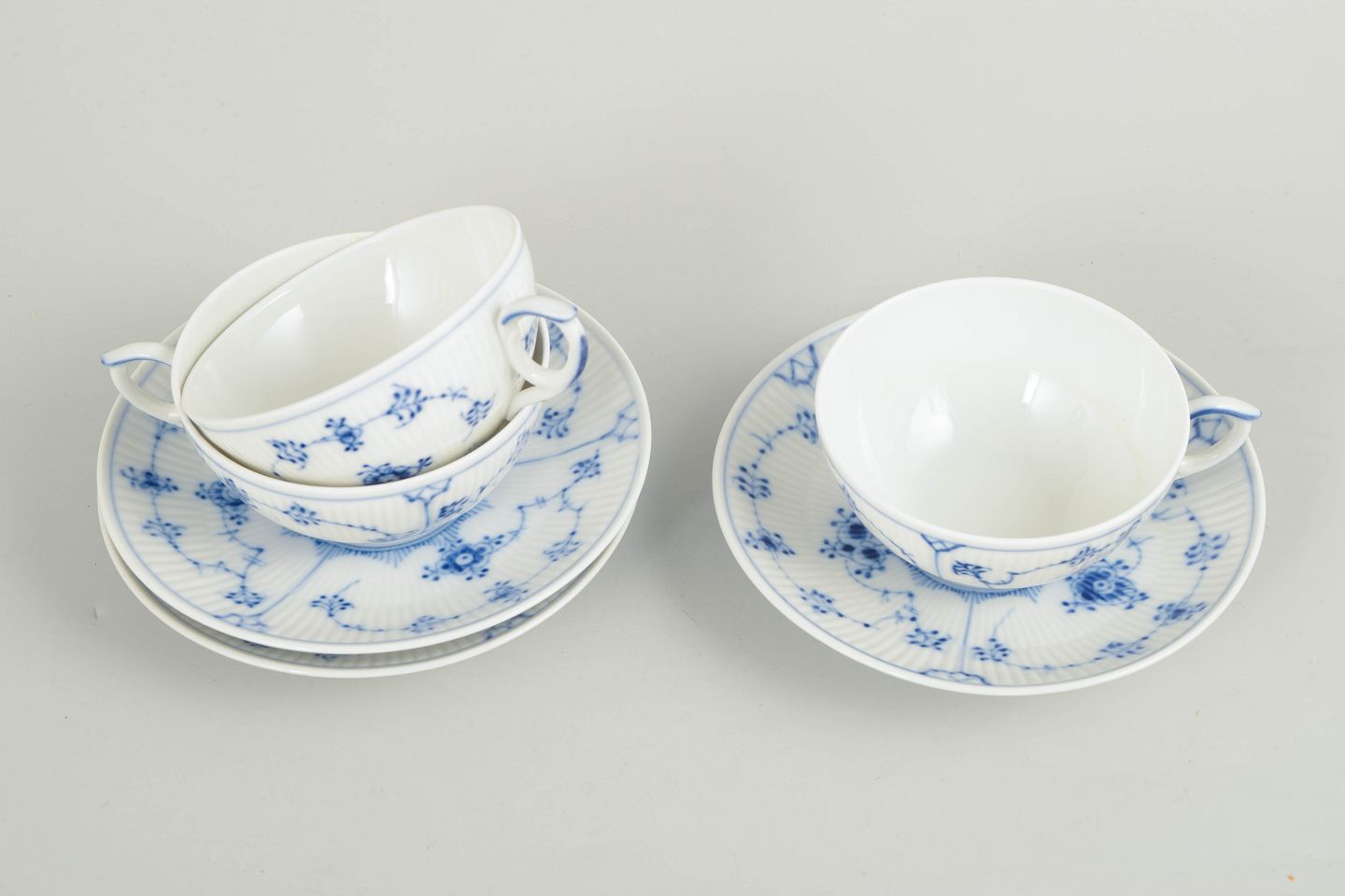 Royal Copenhagen Musselmalet Riflet sæt af tre tekopper med tilhørende underkopper.
