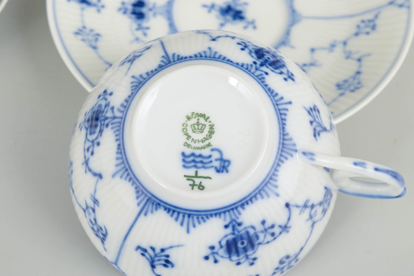 Royal Copenhagen Musselmalet Riflet sæt af tre tekopper med tilhørende underkopper.