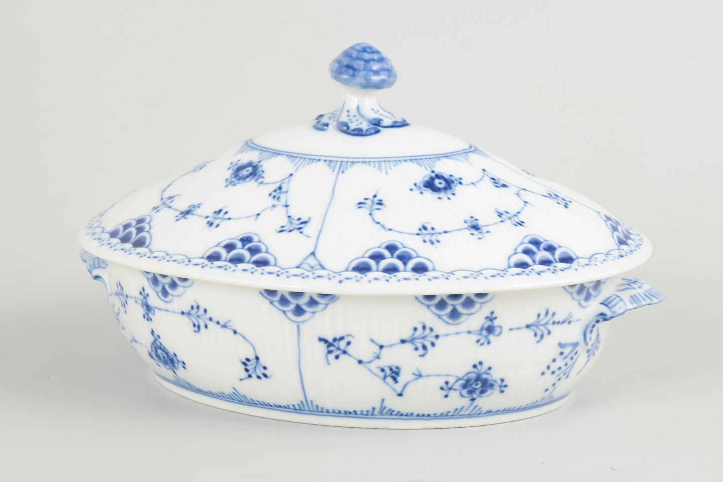 Oval terrin med låg i håndmalet porcelæn fra Musselmalet Halvblonde med klassisk underglasurdekoration i koboltblå og karakteristisk blondekant. Model 1/622. H. 16 cm, B. 26 cm. Første sortering. Fremstillet i 1980’erne.