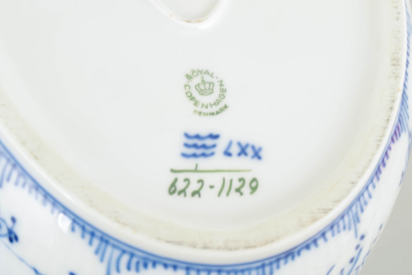 Royal Copenhagen Musselmalet Halvblonde oval terrin med låg.