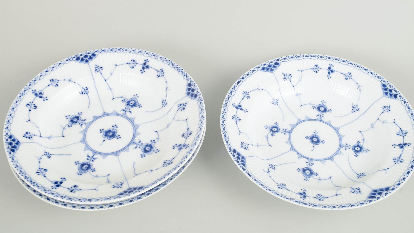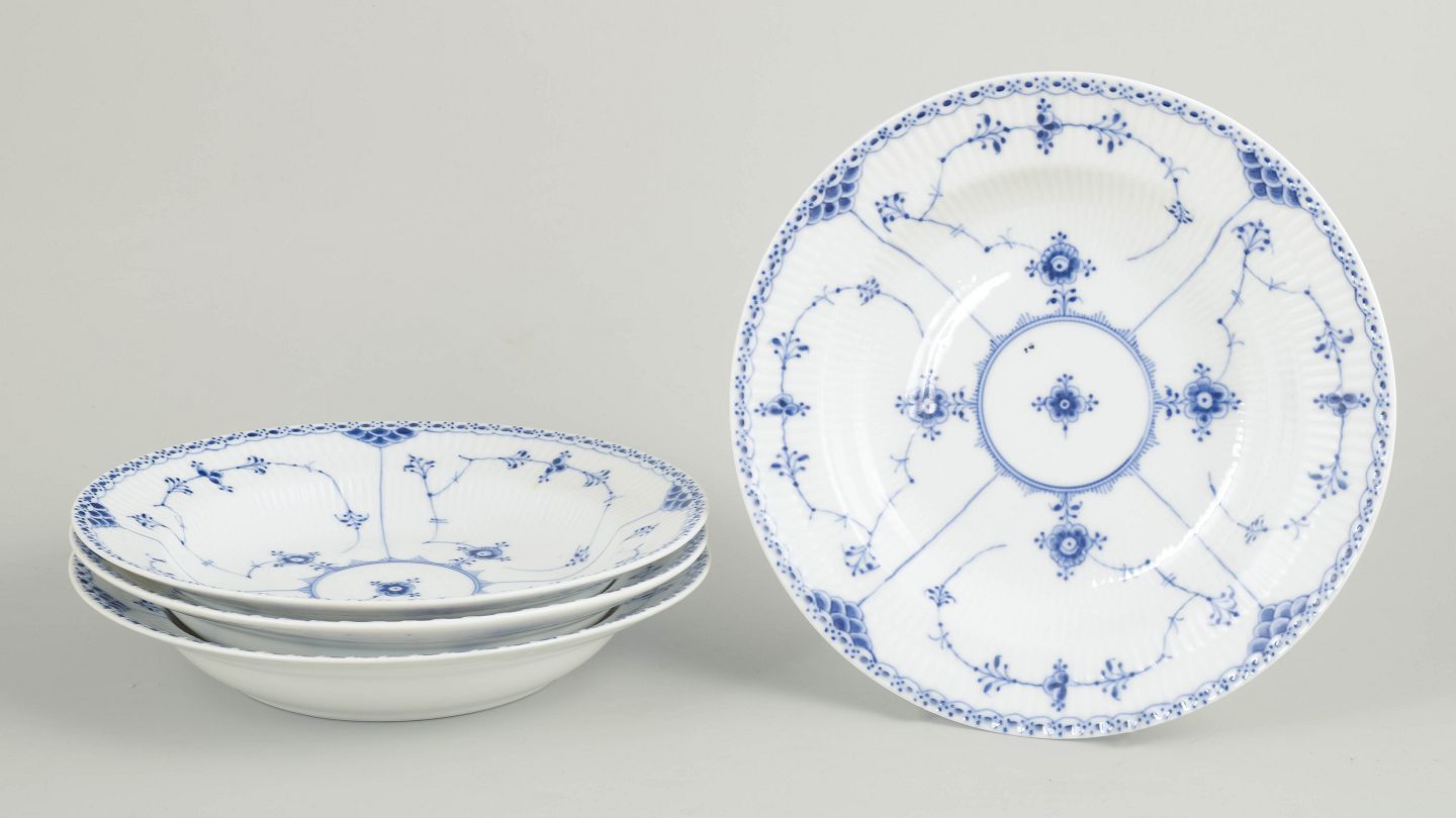 Royal Copenhagen Musselmalet Halvblonde sæt af fire dybe tallerkener.