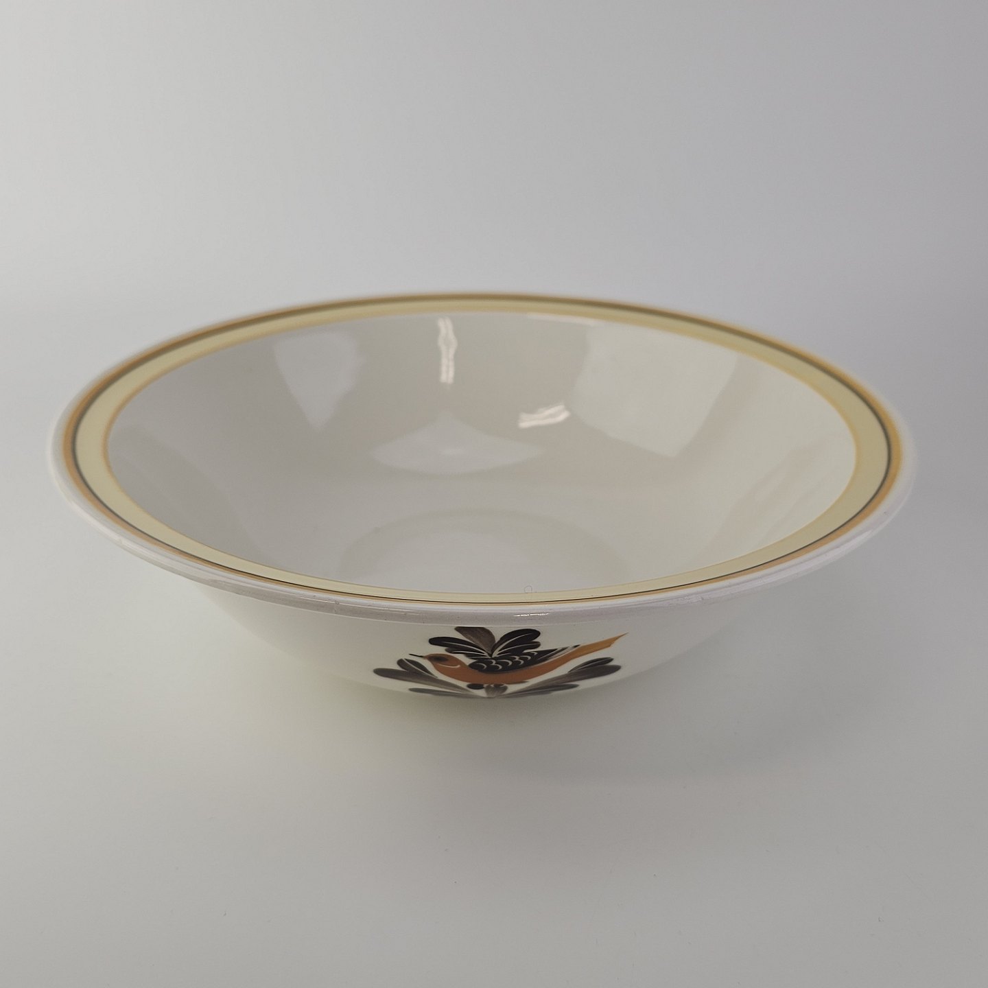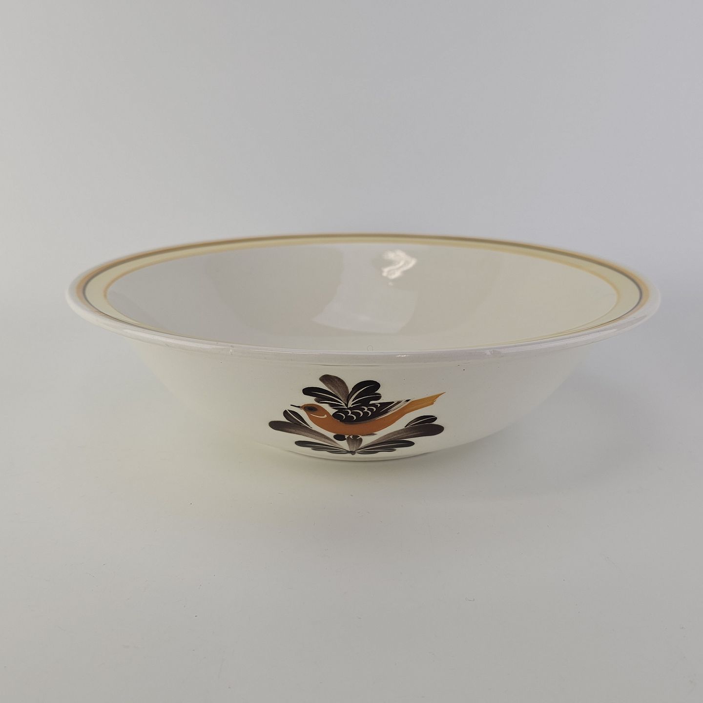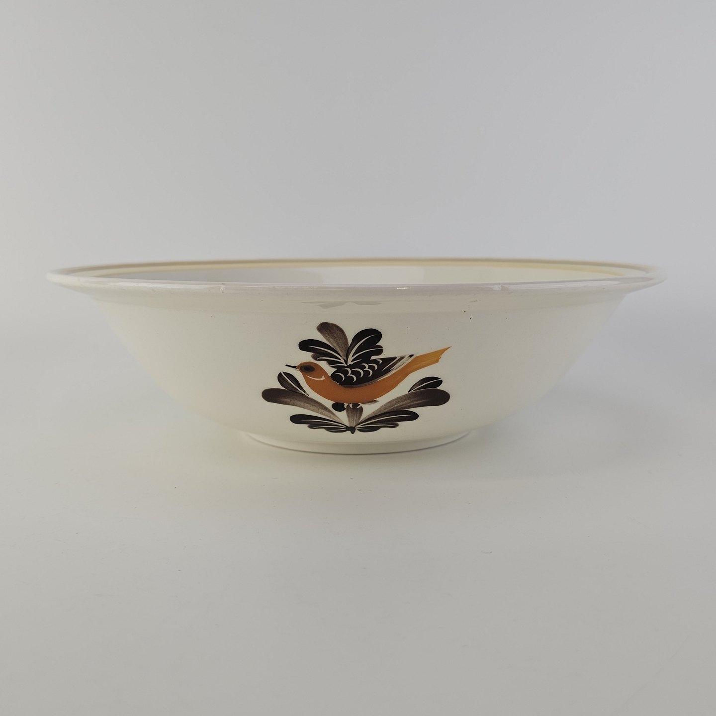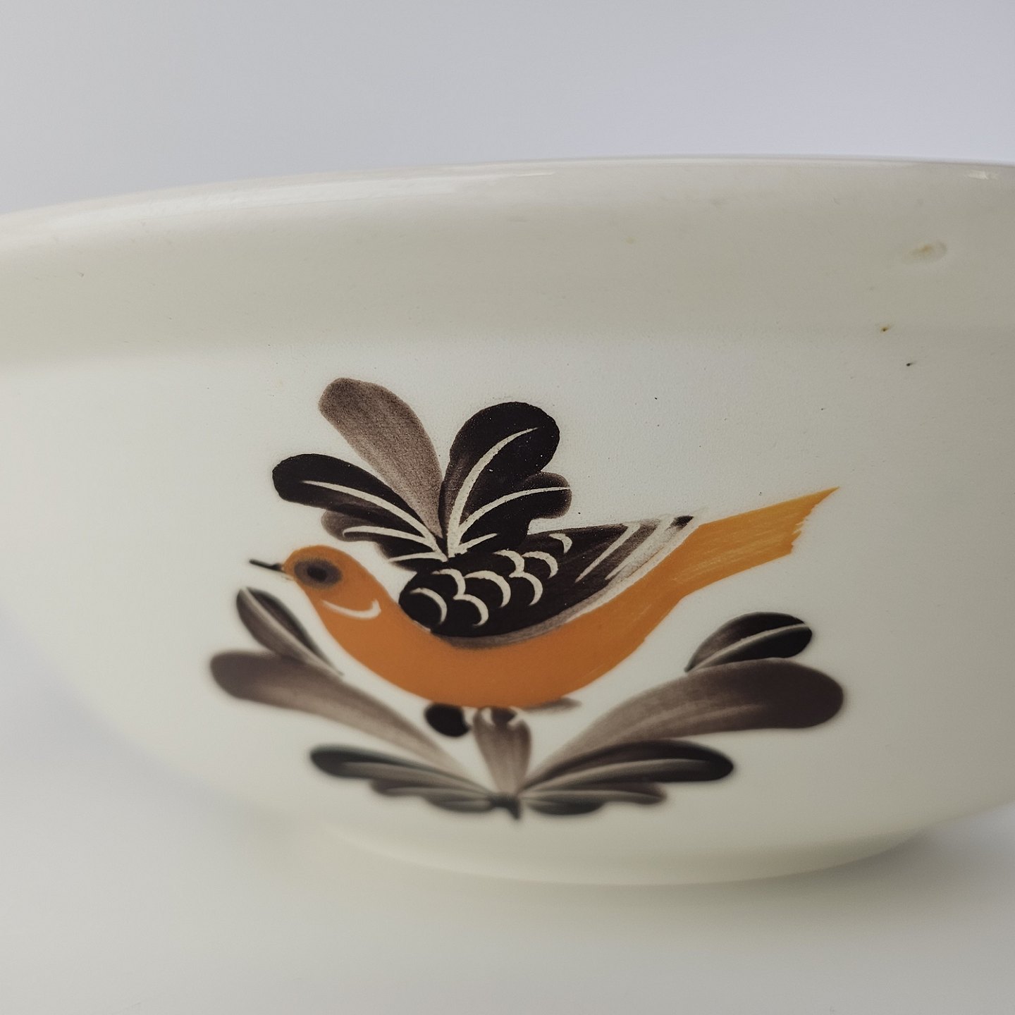 Hvidt fajancestel i stelform G med motiv af en orange og brun fugl og kant.