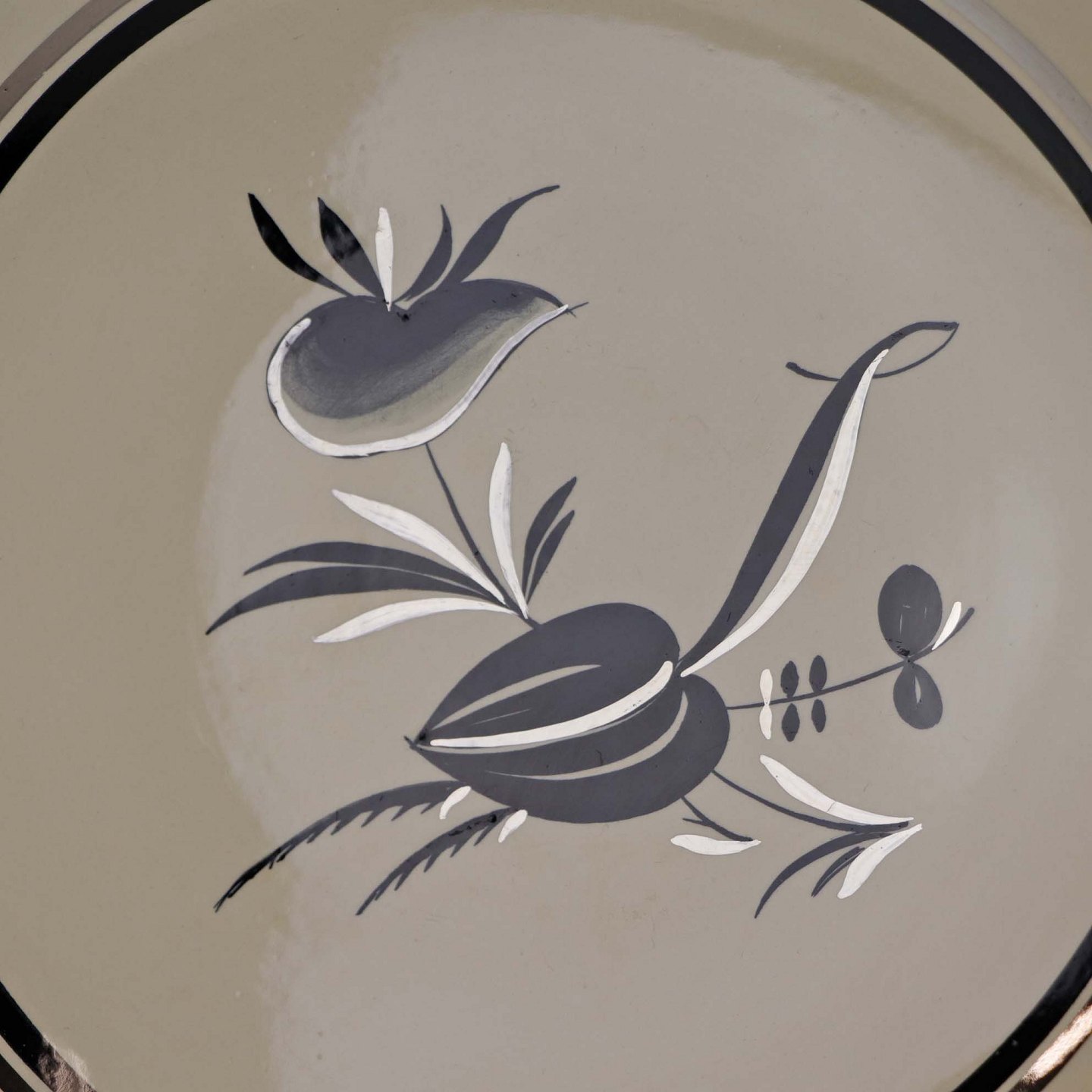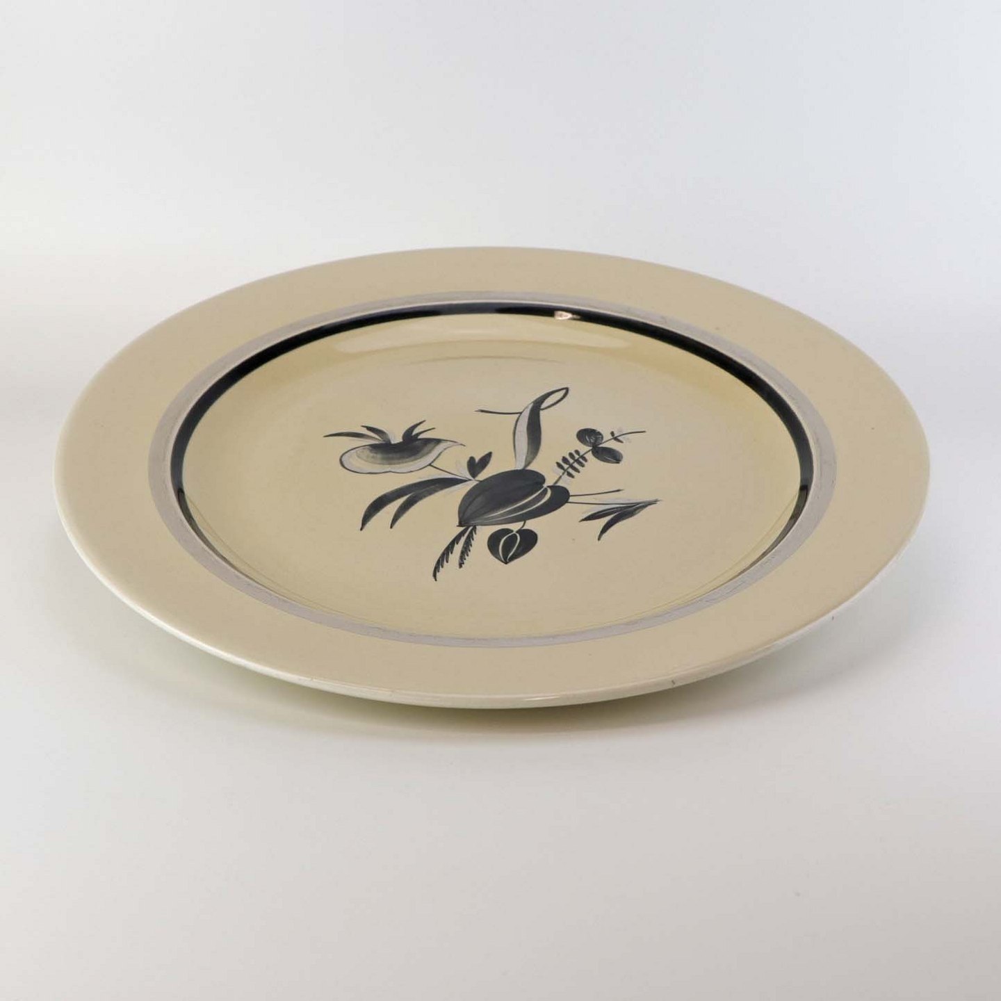Råhvidt fajancestel i stelform E med dekoration af naturmotiver i sølv og sort farve.