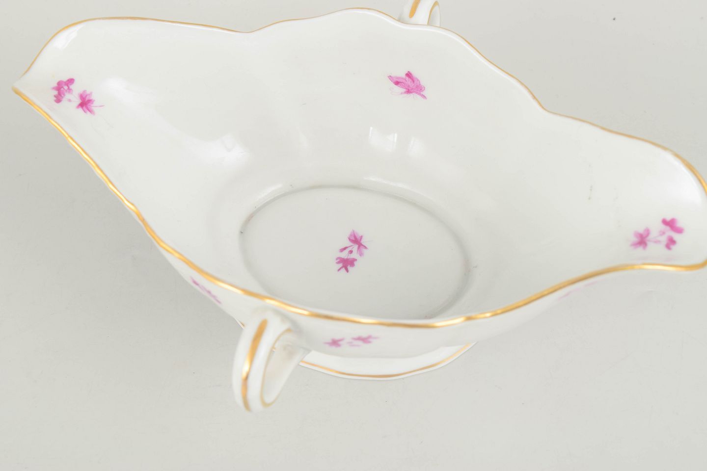 Elegant saucekande i porcelæn fra Herend dekoreret i Apponyi Pink med stiliserede blomster i rosa nuancer og fin forgyldt rand. Formen er klassisk med svungne sider og markant greb, hvilende på lav standfod. Et raffineret eksempel på fabrikkens karakteristiske dekoration og høje håndværksmæssige kvalitet fra midten af det 20. århundrede.