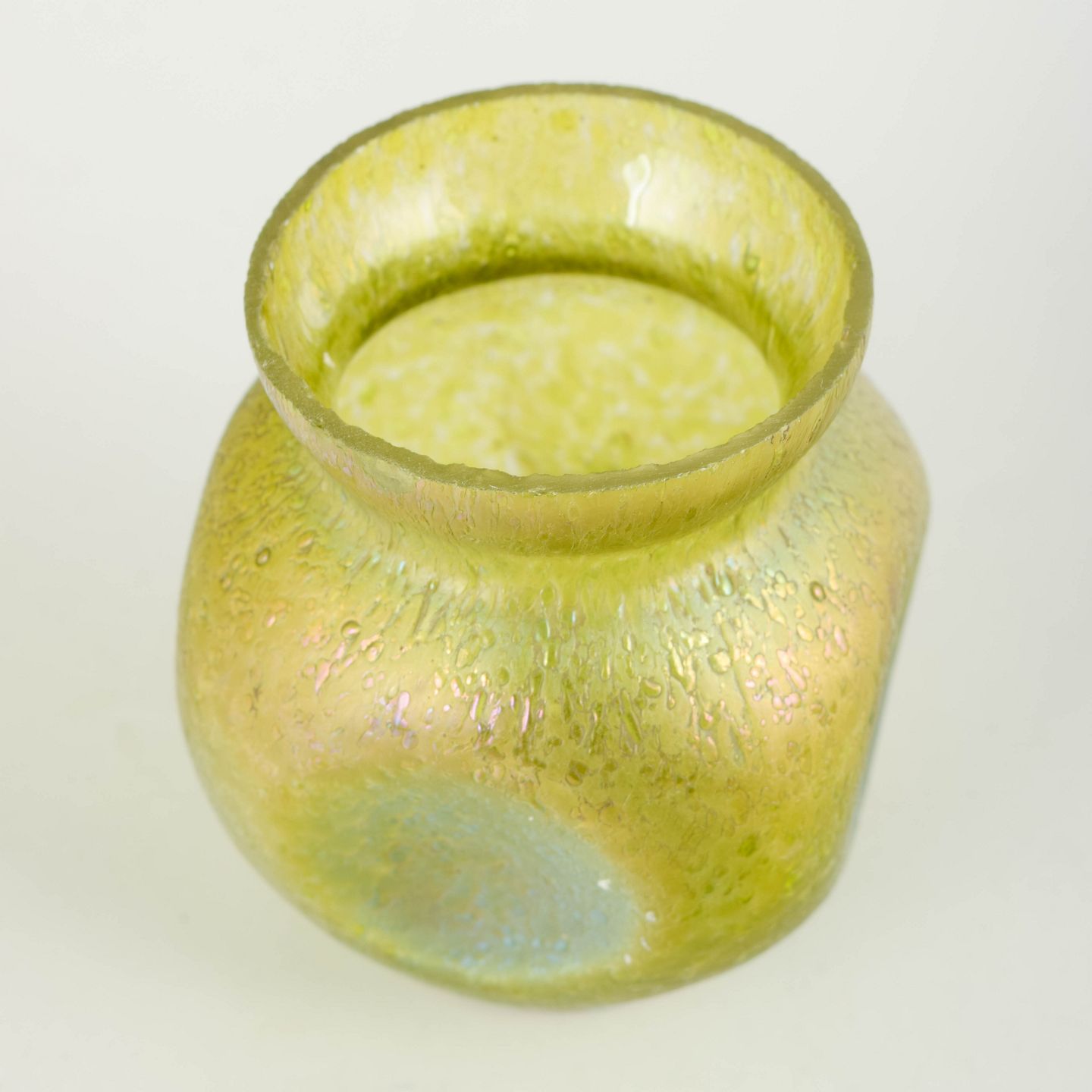 Kompakt vase i mundblæst glas med kraftig iriserende overflade i gulgrønne og blålige nuancer. Den rundede korpus med let udadbøjet hals og subtile, organiske strukturer i glasset er karakteristisk for Loetz’ mellemkrigsproduktion, hvor levende farvespil og metallisk glans var centrale virkemidler.
