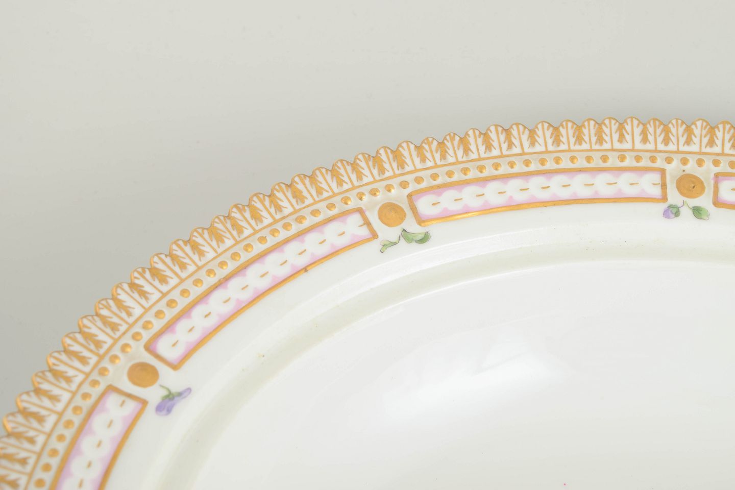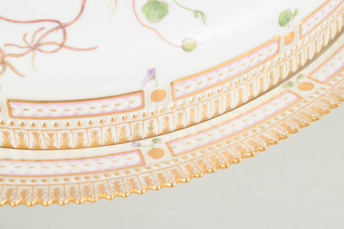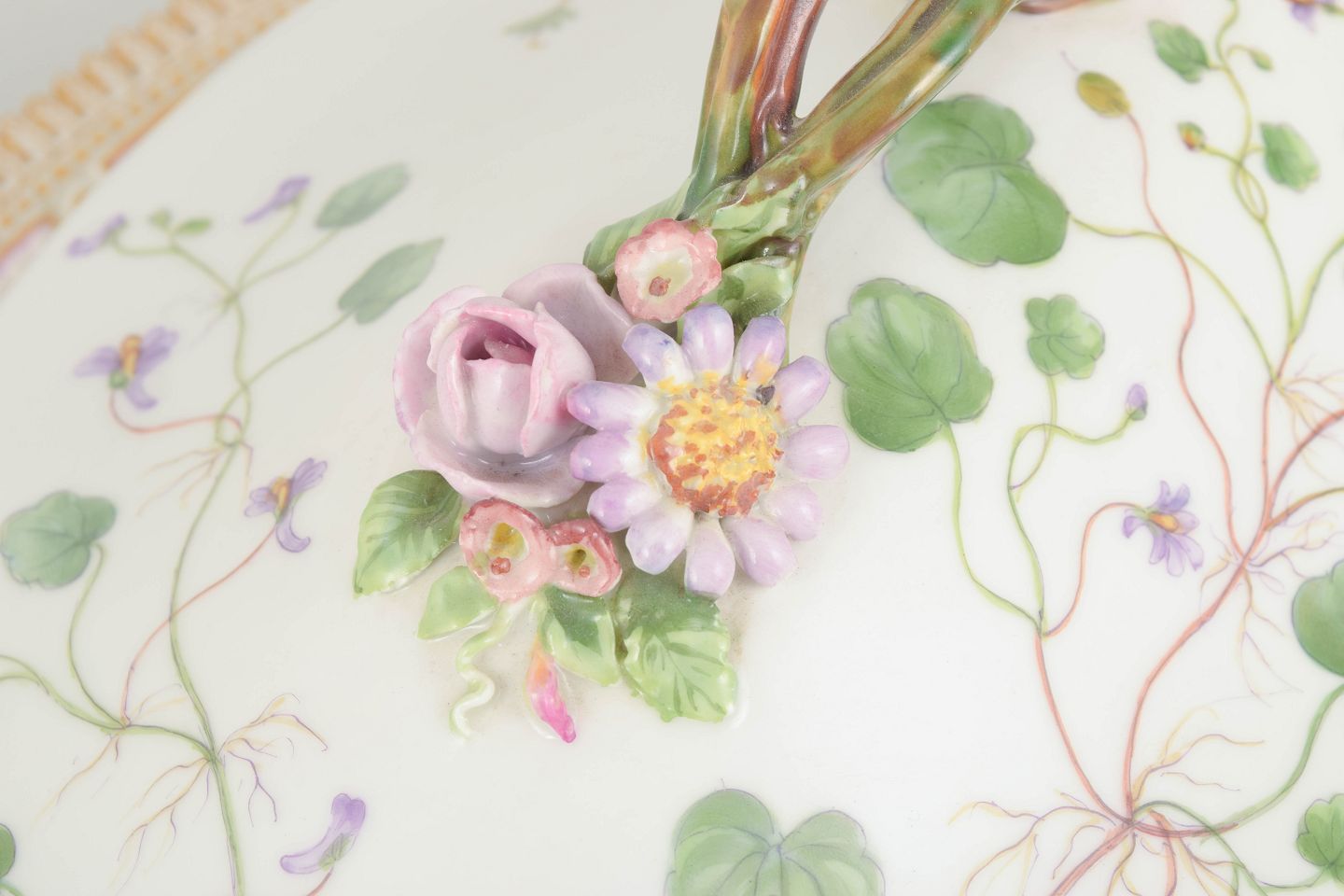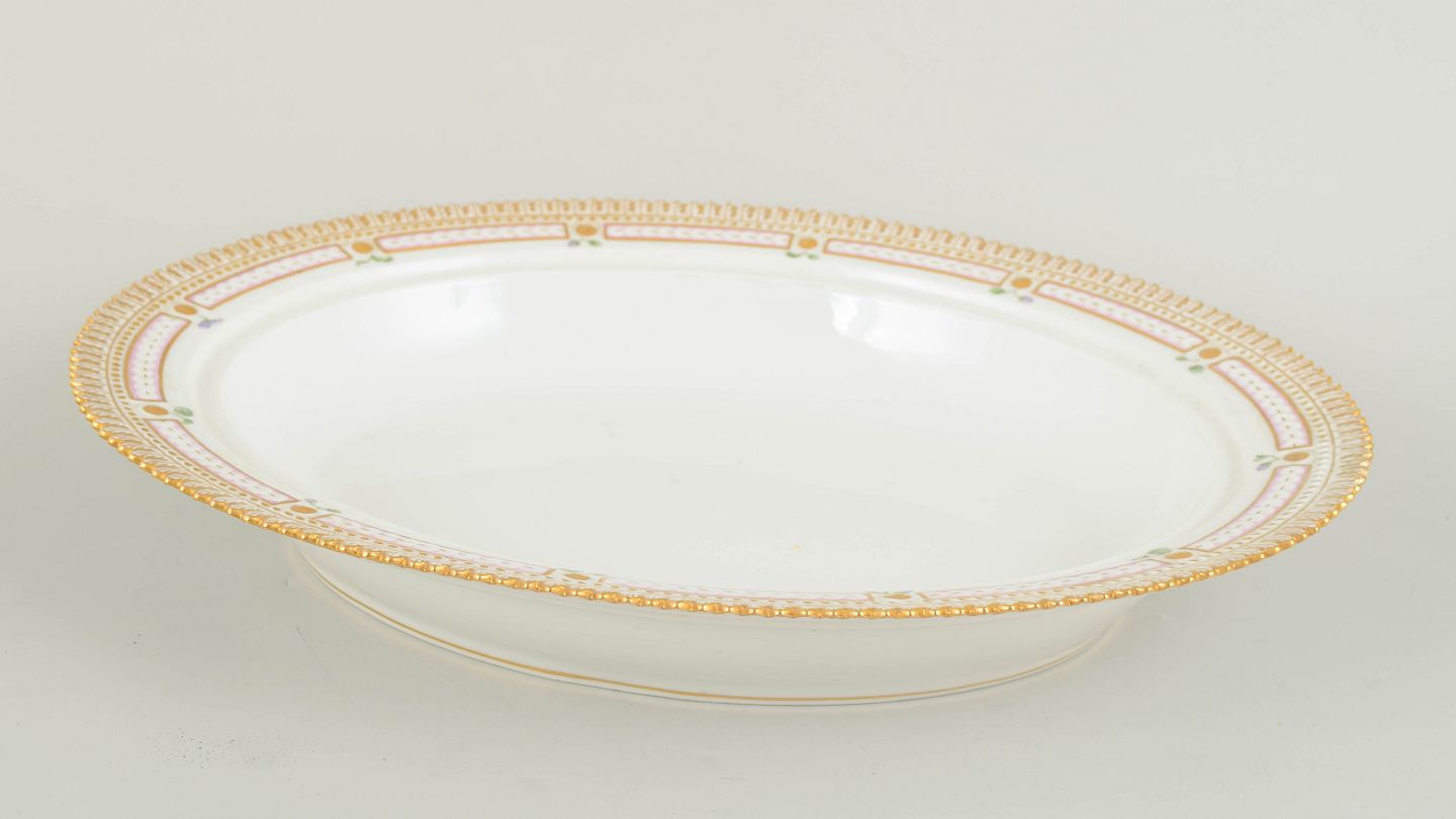 Imponerende og monumentalt udført lågfad i håndmalet porcelæn fra Flora Danica-serien, dekoreret med botanisk motivet Linaria Cymbalaria Mill., sirligt gengivet med videnskabelig præcision og forfinet penselføring. Låget er rigt udsmykket med naturalistiske blomster og slyngende ranker, afsluttet med relief modelleret knop med blomsterdekoration. Foden og randen er dekoreret med forgyldte detaljer og klassisk kantornamentik. Model 20/3567.
