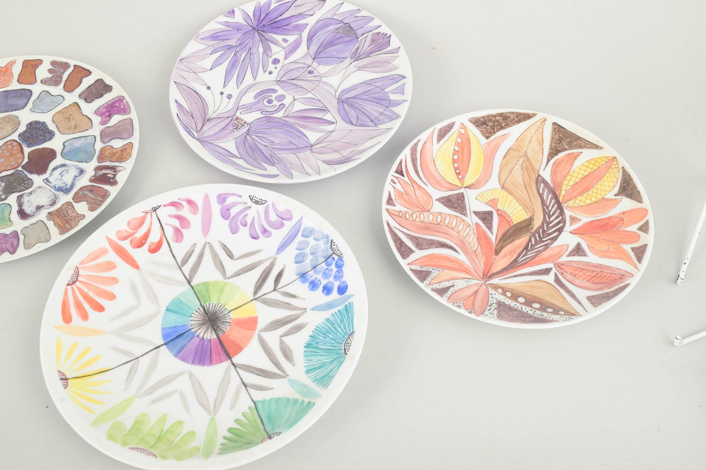 Dekorative tallerkener i håndmalet porcelæn med individuelle mønstre i organiske og geometriske former i varme og violette farvetoner.