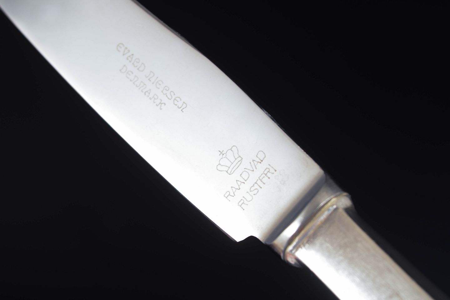 Elegante frokostknive i sterlingsølv og rustfrit stål. Model nummer 14 med klassisk, let afrundet skaftform med diskret perlekant og glat klinge. Fremstillet hos Evald Nielsen.