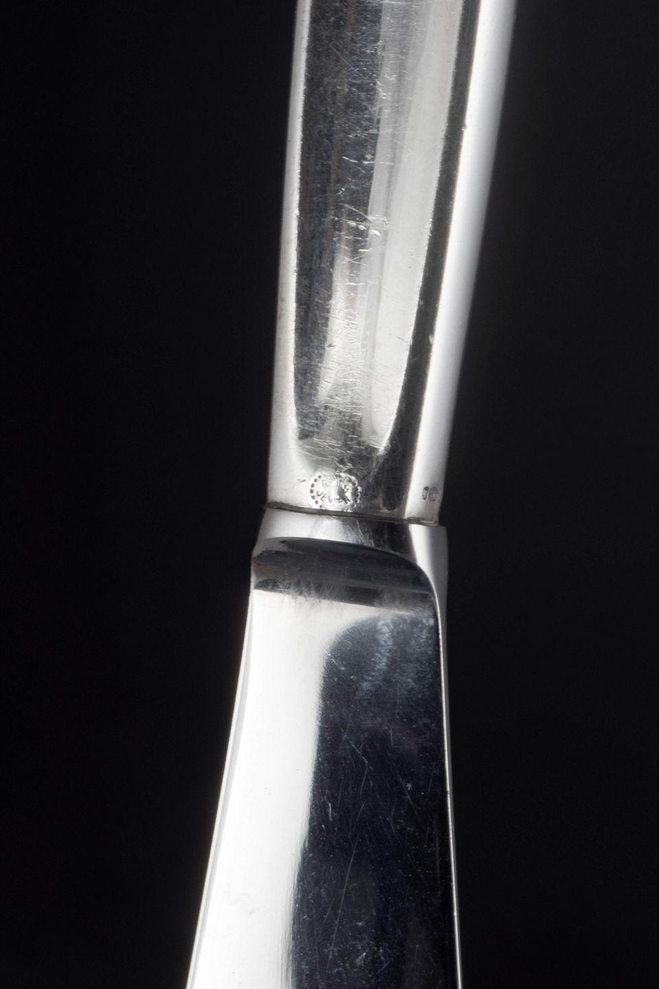 Sæt af seks frokostknive i rustfrit stål og sterlingsølv i modellen Cypress fra Georg Jensen. Bestikket er udført i et slankt og elegant formsprog med let konisk form og glatte, moderne linjer, karakteristisk for Georg Jensens efterkrigsdesign.