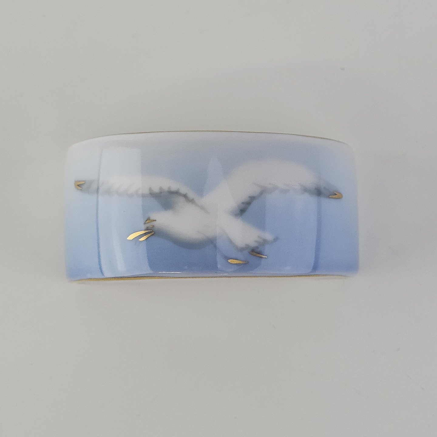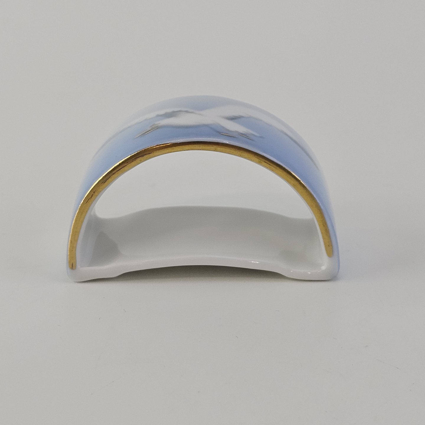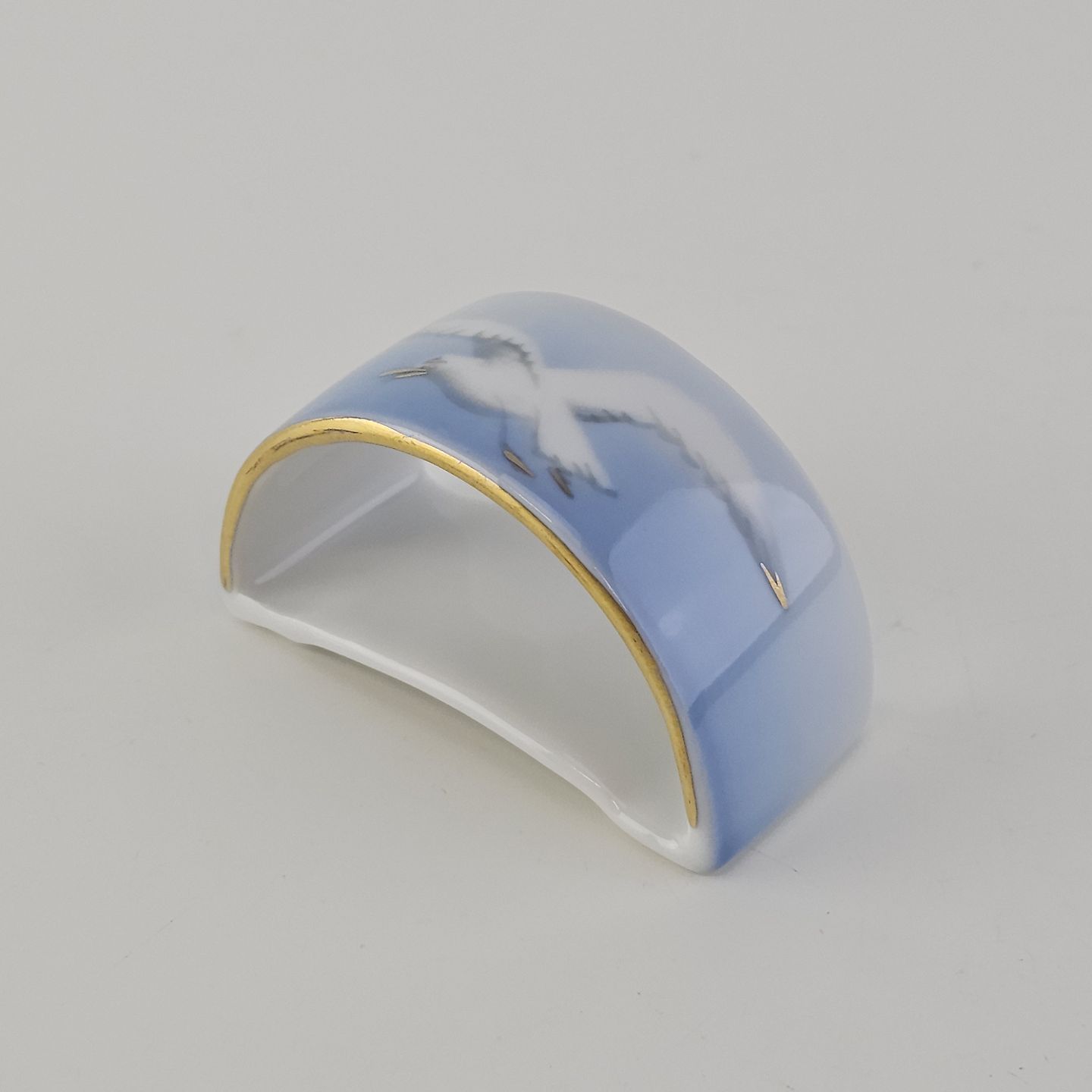 Stellet er af porcelæn i blålige farver med motiv af måger og guldkant