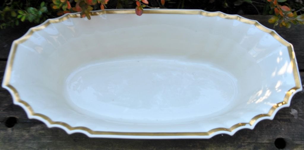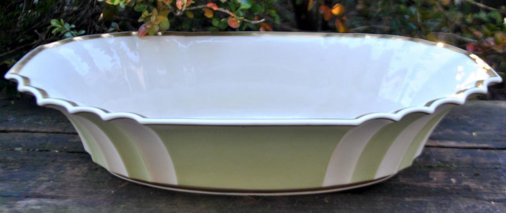 Royal Copenhagen jardiniere 988/3384, 20. årh. København, Danmark. Cremefarvet med grøn fond og forgyldninger. Stemplet. H: 9,3 cm. L: 37,5 cm. B: 19,5 cm.