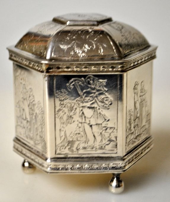 Bryllups æske, kopi af original fra 17. årh. Holland fra Metropolitan Museum of Art, New York, 20. årh. Sekskantet med 1600-tals motiver på alle sider. Låg dekoreret med engle, blomster og håndfæstning. På tre fødder. Messing med sølv. Indvendig lueforgyldt. Stemplet: MMA. H: 7 cm.