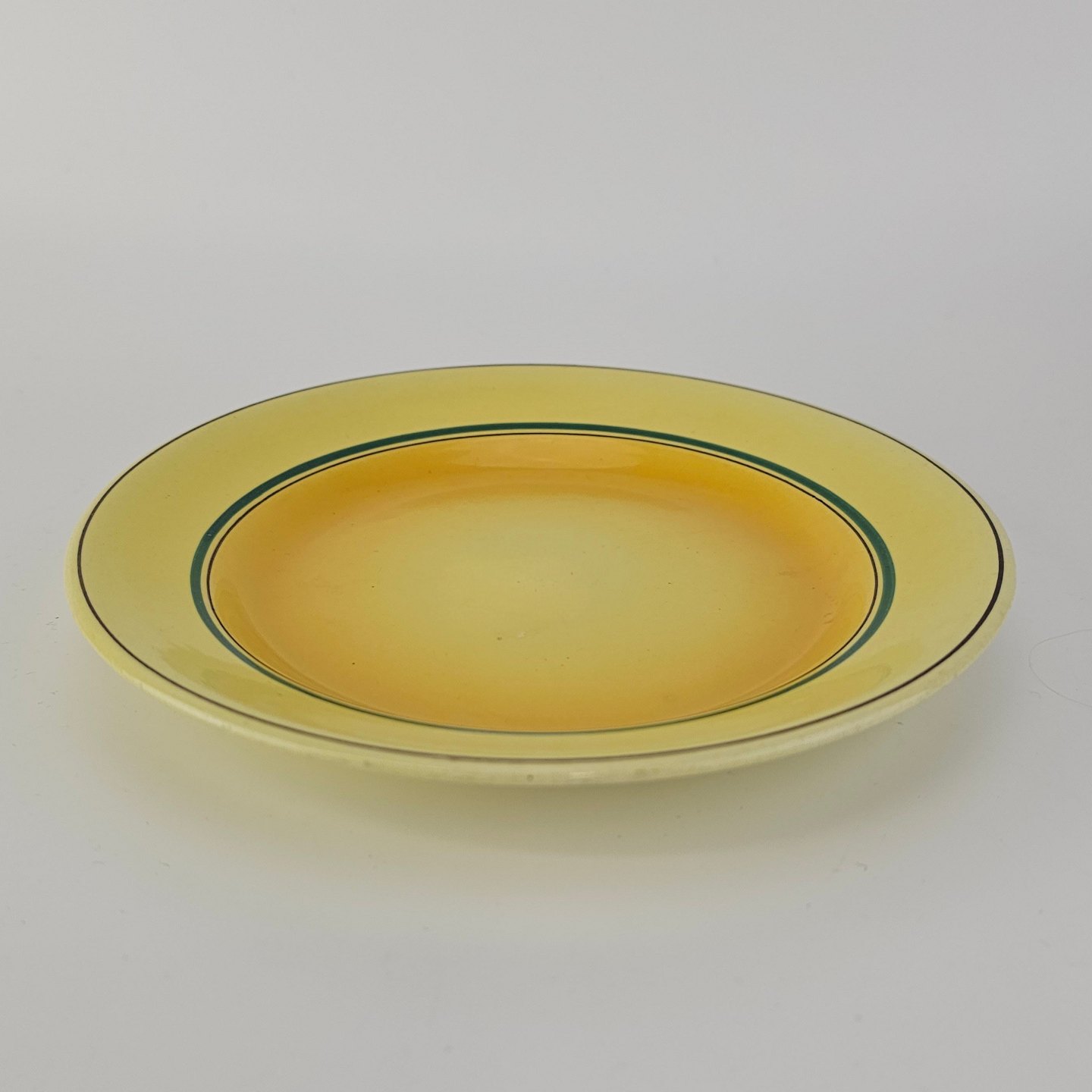 Fajancestel i stelform C med dekoration i gule nuancer med grøn stribe.