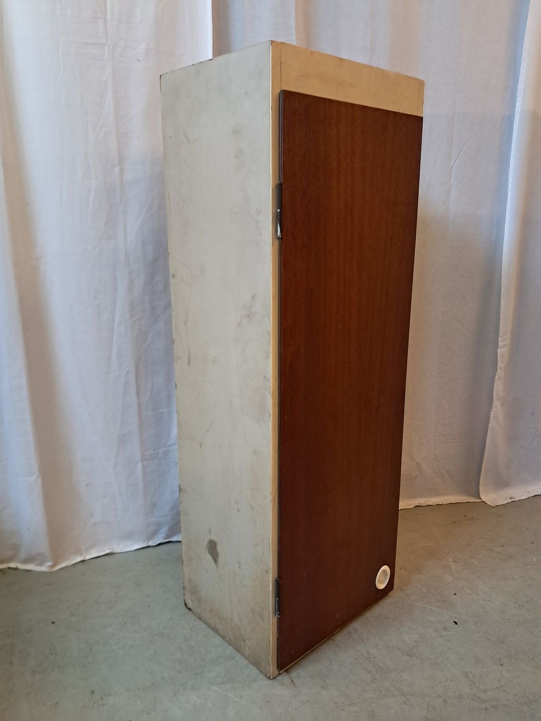 Gammelt malet køkkenskab med låge i fineret mahogni, fra 1950erne.