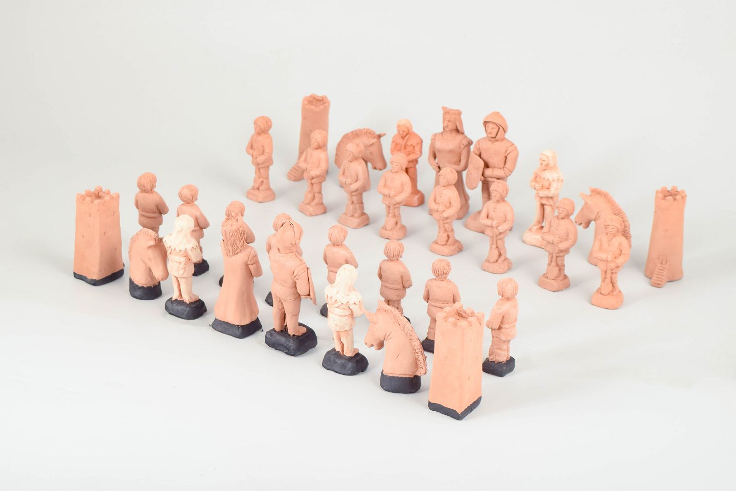 Unikt keramisk skaksæt bestående af toogtredive håndmodellerede figurer udført i uglaseret ler. Figurerne er udformet som stiliserede menneskefigurer og skulpturelle former, hver med individuelle karaktertræk og detaljer. Flere af figurerne er signerede. Sættet fremstår som et kunstnerisk fortolket skakspil med tydelig skulpturel karakter. Fremstillet i 1959.