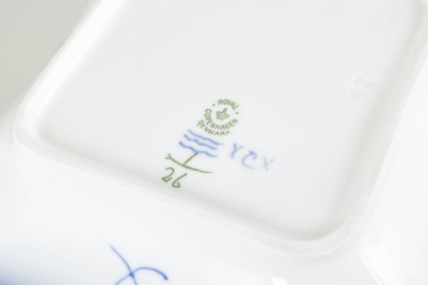 Håndmalet firkantet skål i porcelæn dekoreret med det klassiske musselmalede riflet mønster i blå underglasur. Skålen har svagt buede sider med riflede detaljer og et centralt blomsterornament omgivet af slyngede blomstergrene. Undersiden er fabriksstemplet Royal Copenhagen og annulleret med én indridset streg gennem fabriksstemplet. Model 1/26.