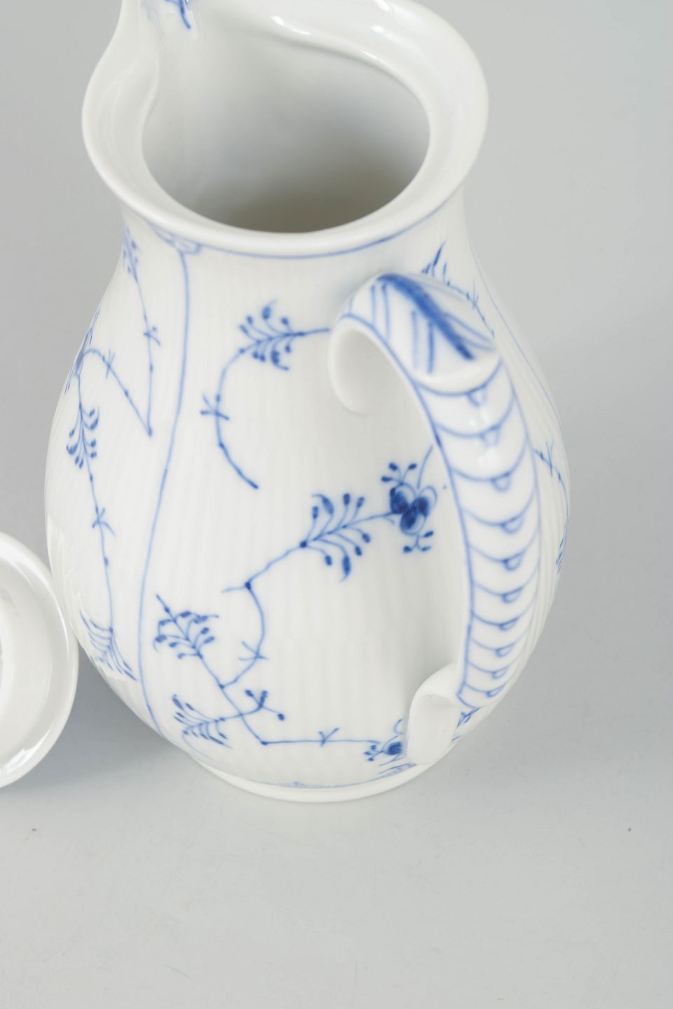 Sjælden håndmalet chokoladekande i porcelæn dekoreret med det klassiske musselmalede riflet mønster i blå underglasur. Formen har en elegant høj korpus med buet tud, svungen hank og kuppelformet låg med knop. Undersiden er fabriksstemplet Royal Copenhagen, første sortering. Model 1/30.