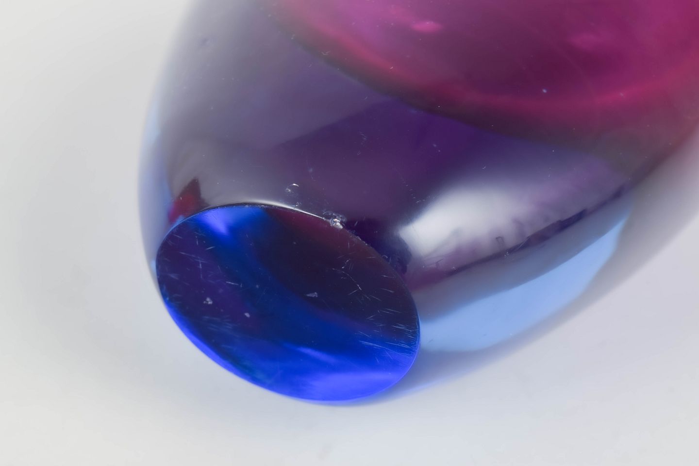 Dekorativ kunstglasvase i klart blåt glas med indkapslet rosa kerne og blød organisk form, udført i karakteristisk Murano-stil med lagdelt glas.