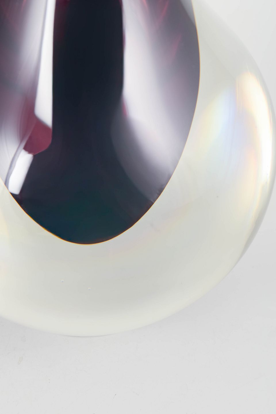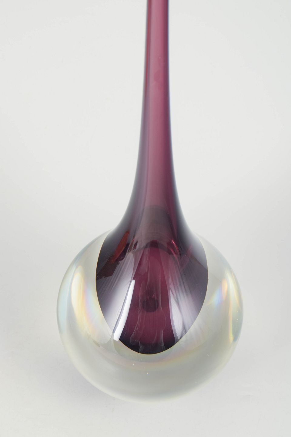 Elegant kunstglasvase i klart glas med indkapslet violet kerne og meget lang slank hals, udført i karakteristisk Murano-stil med skulpturel dråbeform.