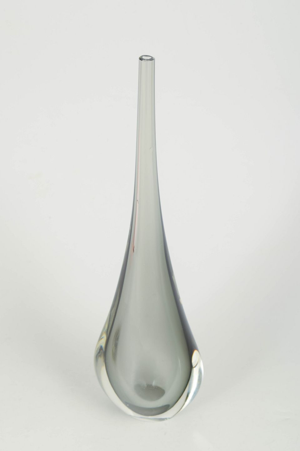 Slank kunstglasvase i klart glas med elegant dråbeformet silhuet og lang smal hals, udført i karakteristisk Murano-stil med tung bund og raffineret form.