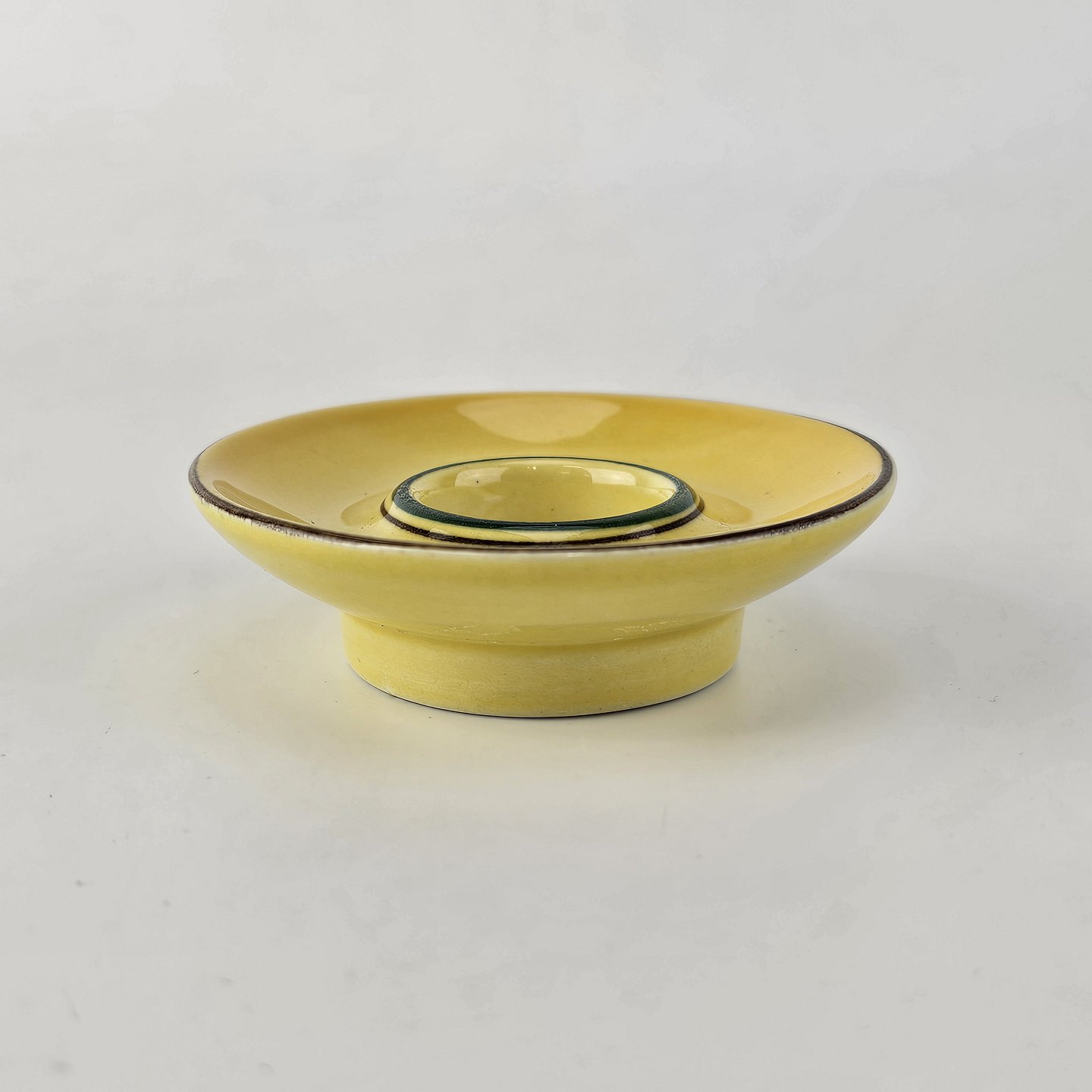 Fajancestel i stelform C med dekoration i gule nuancer med grøn stribe.