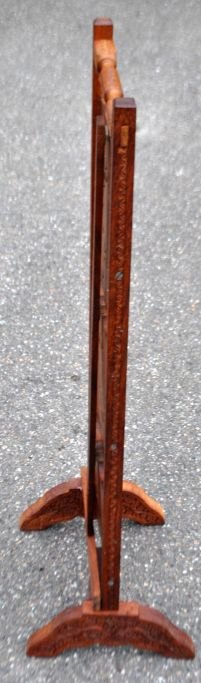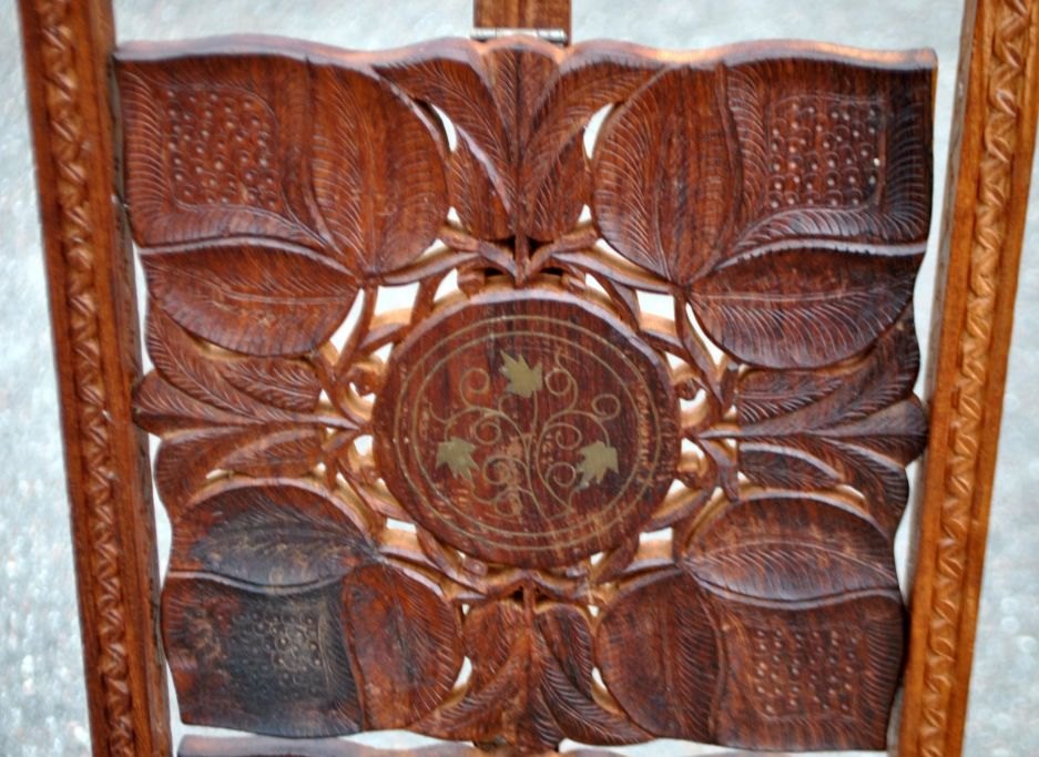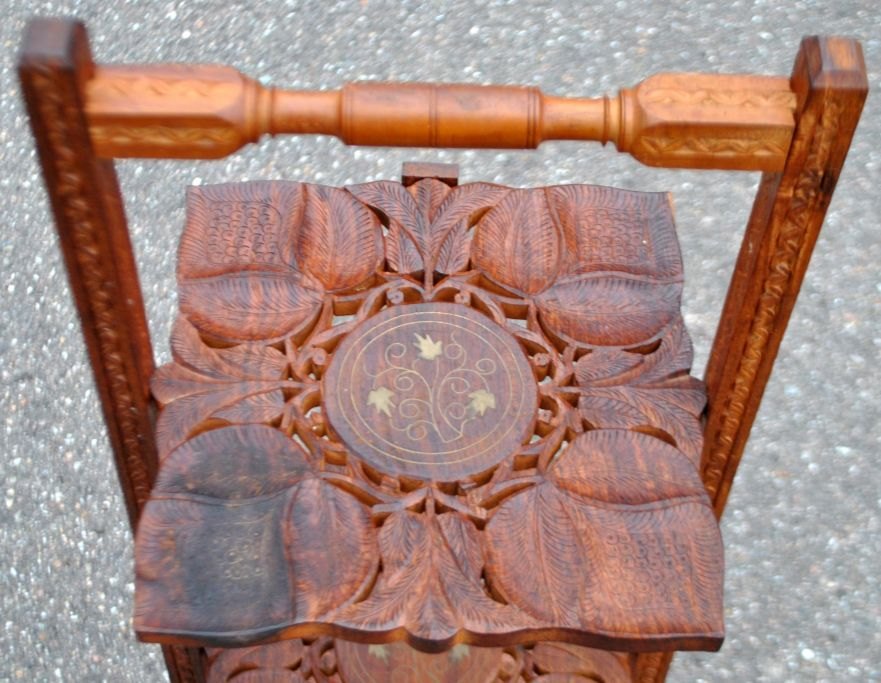Cake stand i teak træ, 19. årh. Indien. Med tre etager med udskæringer af blomster og blade. Med messing intarsia i form af blomster. H: 80,5 cm. B: 27,5 cm. D: 24 cm.
