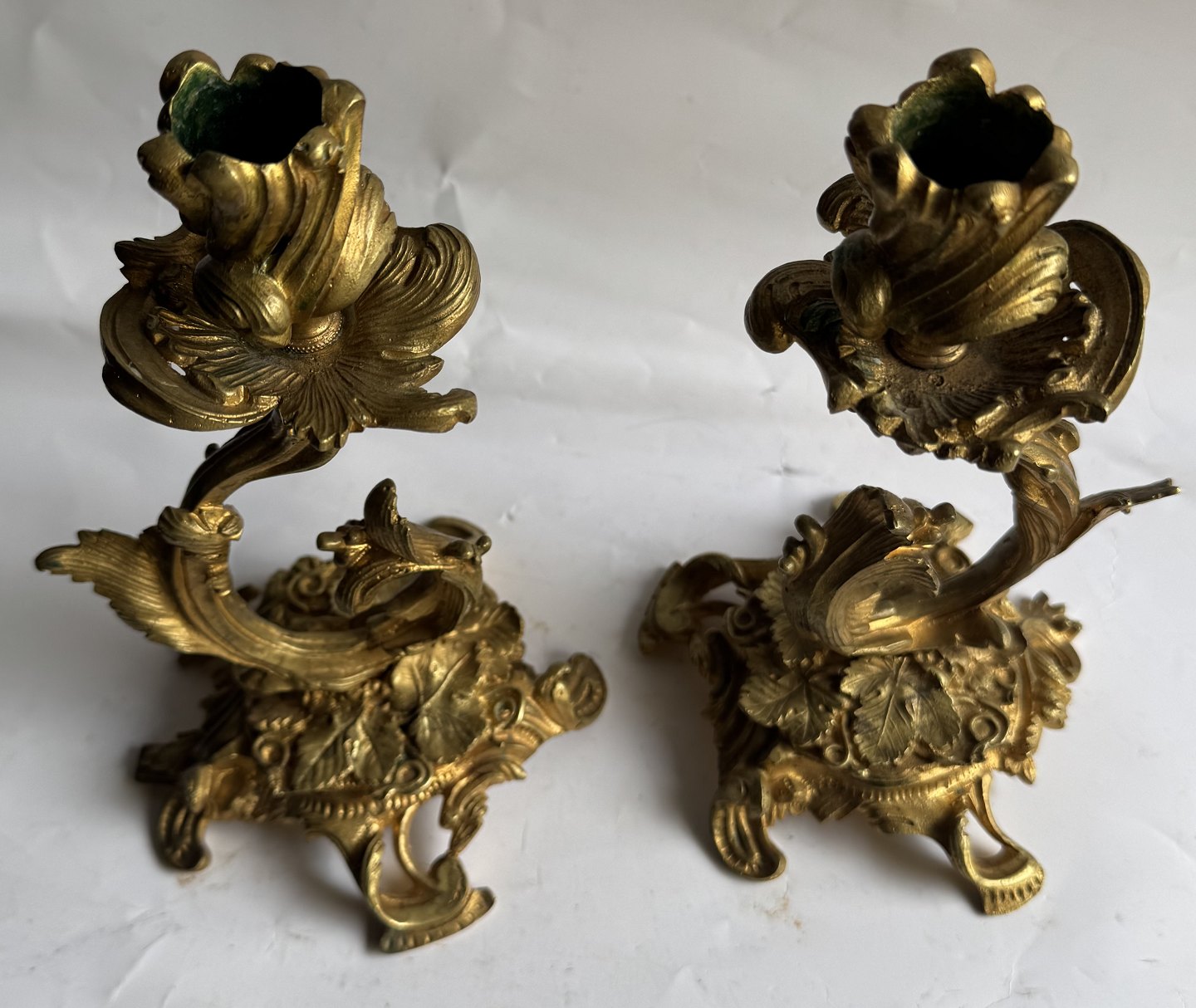 Par rococo lueforgyldte lysestager i bronce fremstillet i Frankrig midt i 19. århundrede. Fremstår i god stand med ganske få brugsspor. H. 22,5 cm.